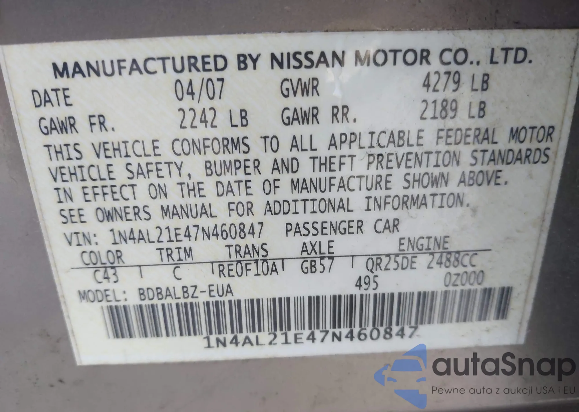 LOT: 44217925 VIN: 1N4AL21E47N460847