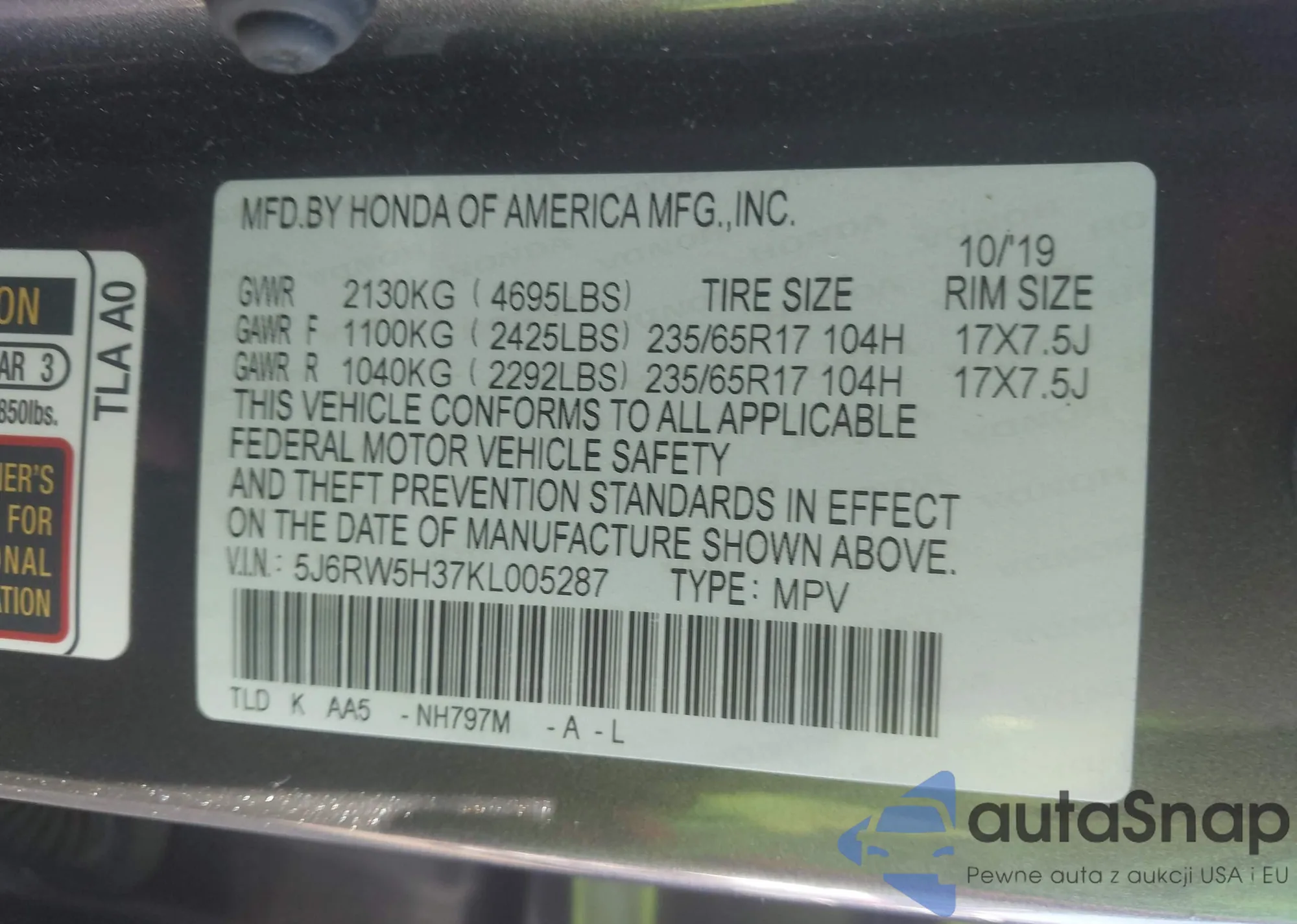 • VIN 5J6RW5H37KL005287
