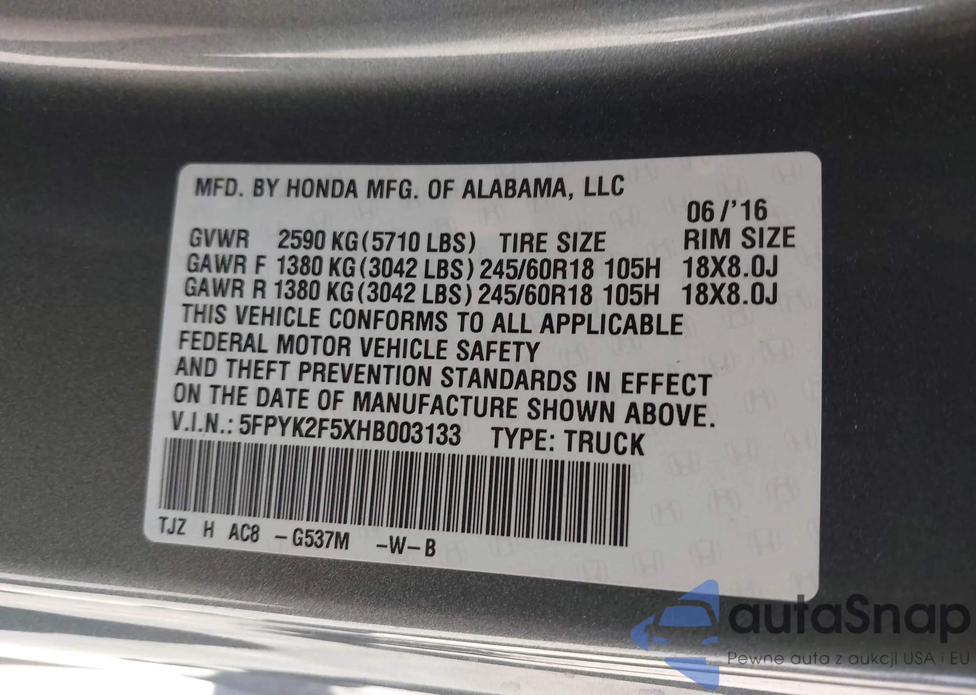 • VIN 5FPYK2F5XHB003133