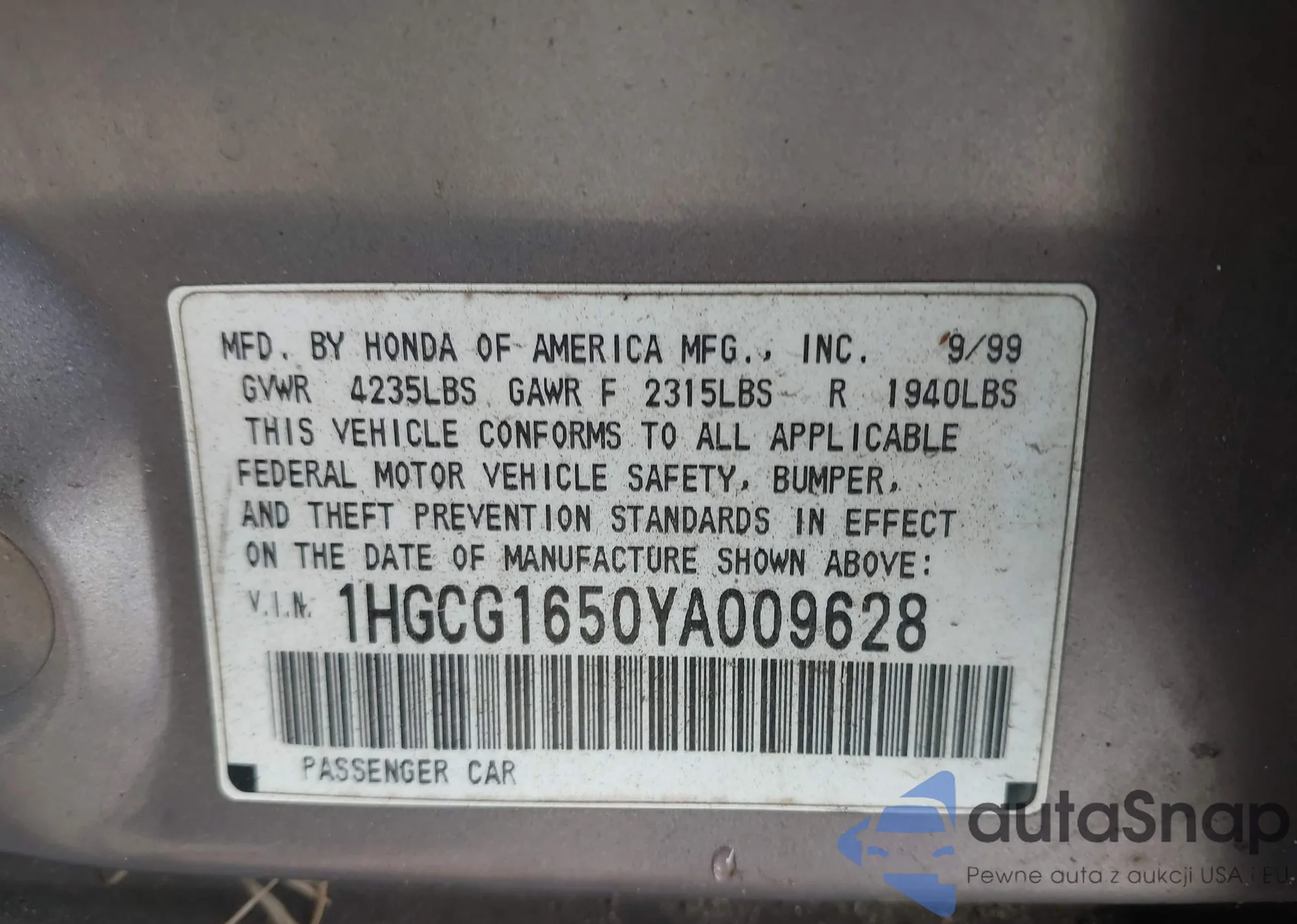LOT: 43889848 VIN: 1HGCG1650YA009628