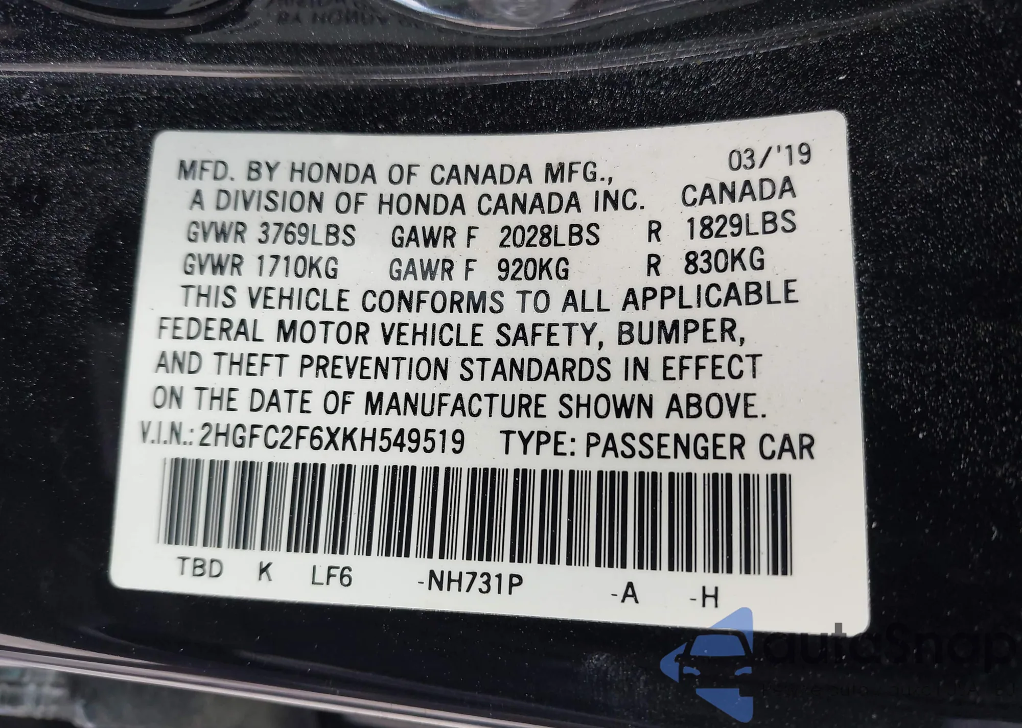 • VIN 2HGFC2F6XKH549519