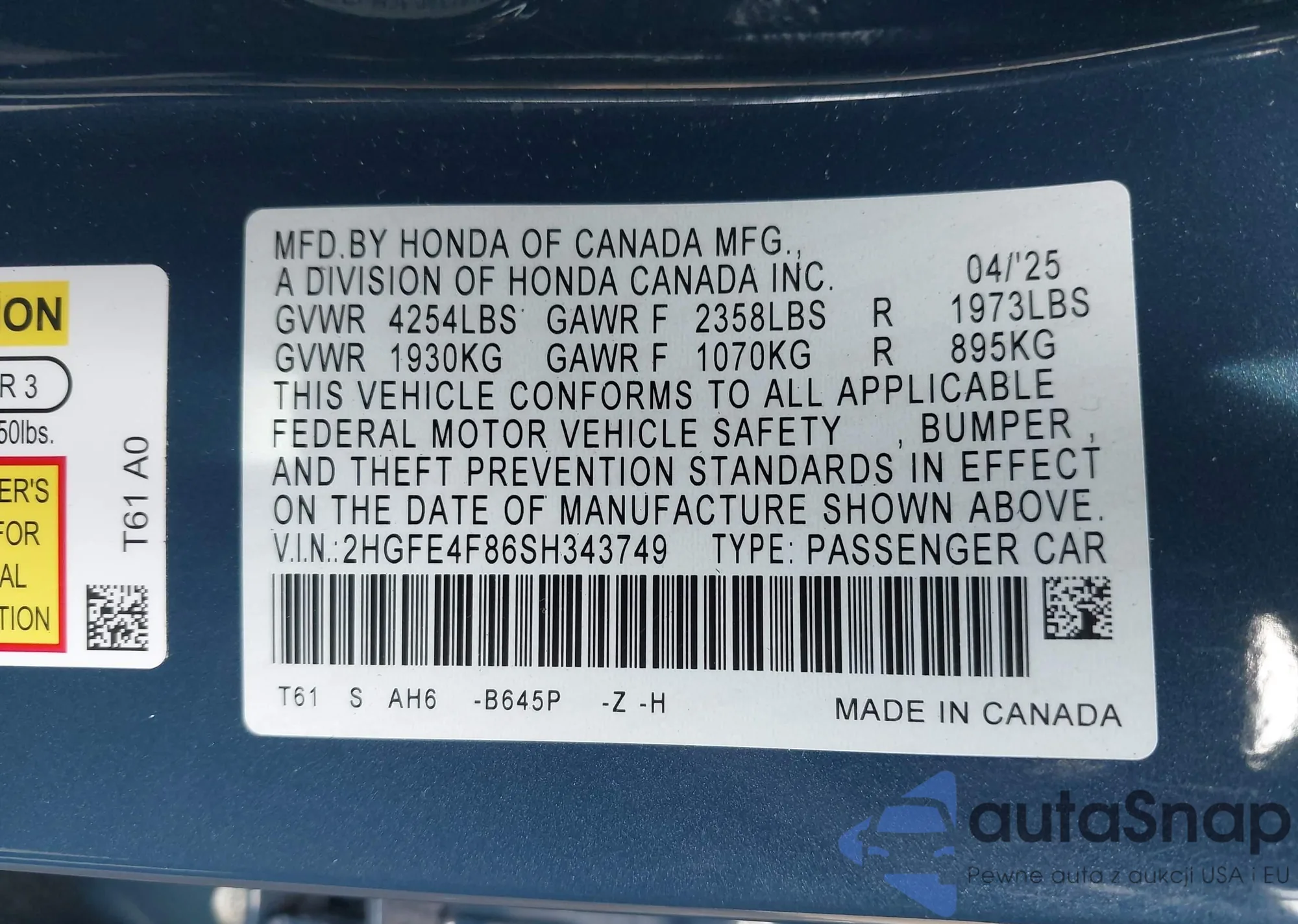 • VIN 2HGFE4F86SH343749