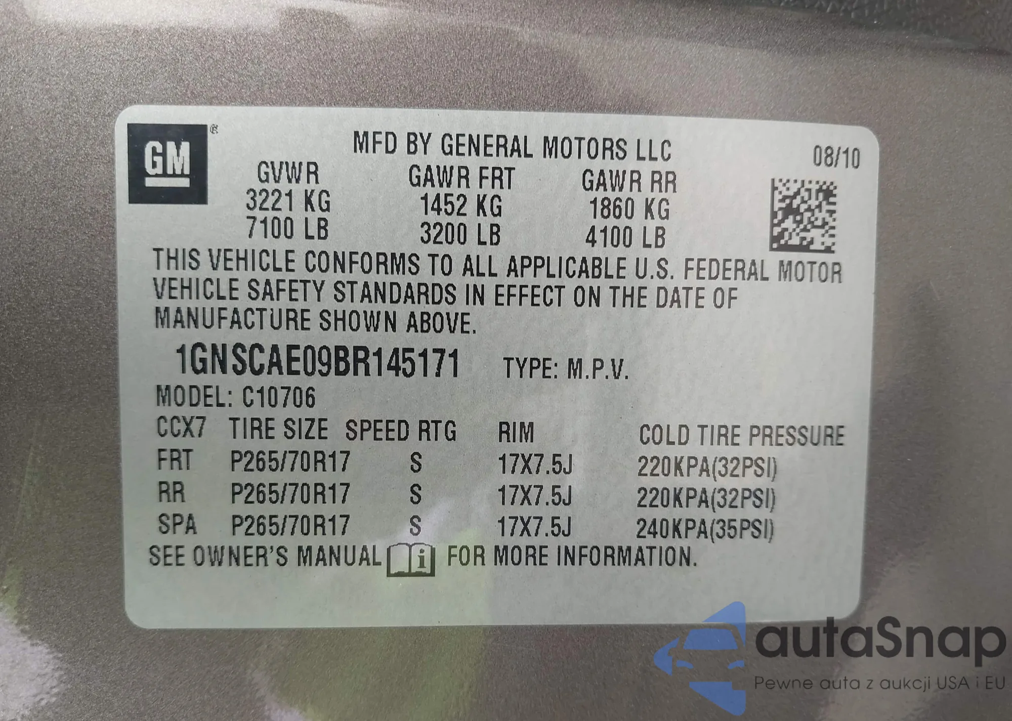 LOT: 44078942 VIN: 1GNSCAE09BR145171