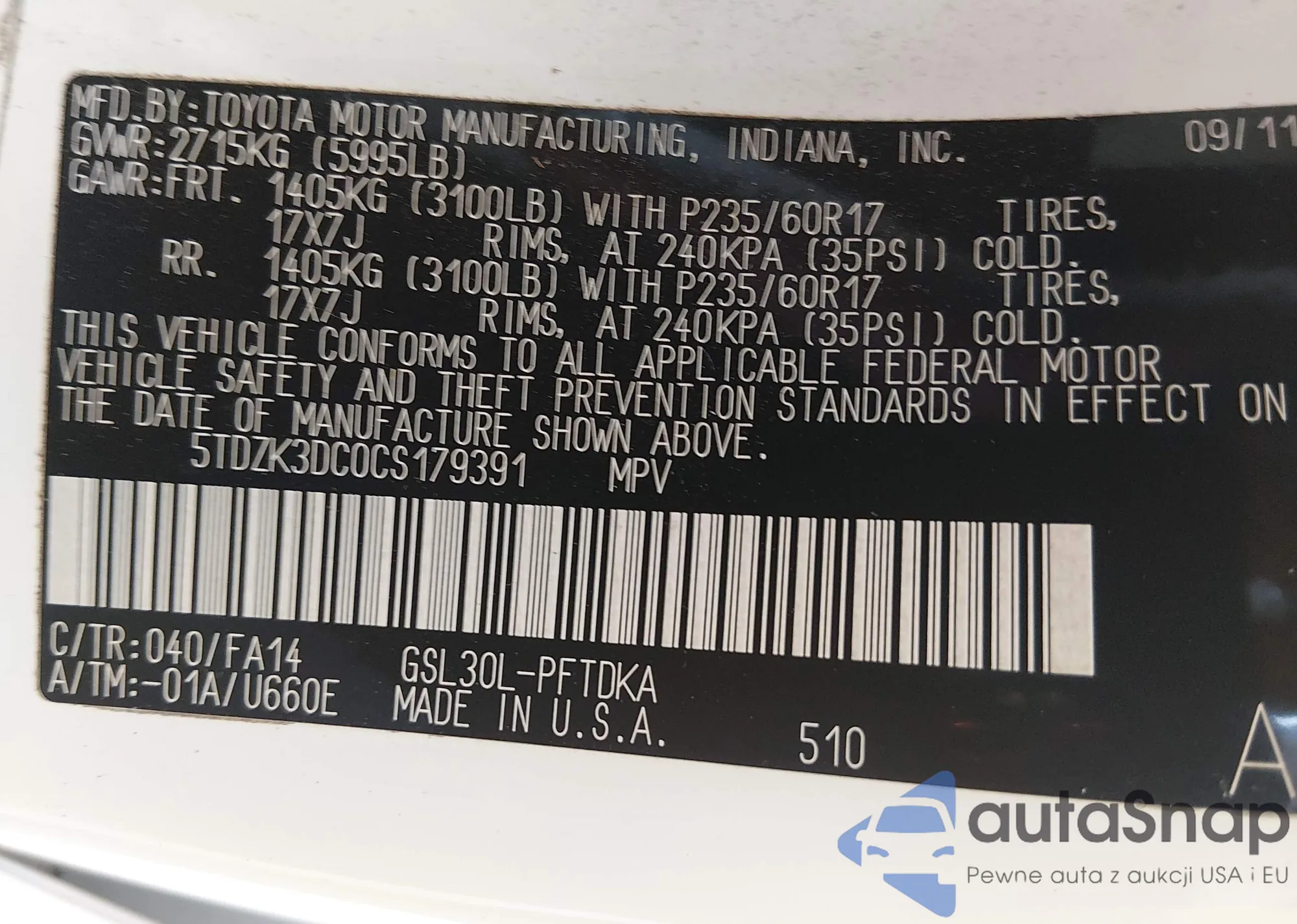 • VIN 5TDZK3DC0CS179391