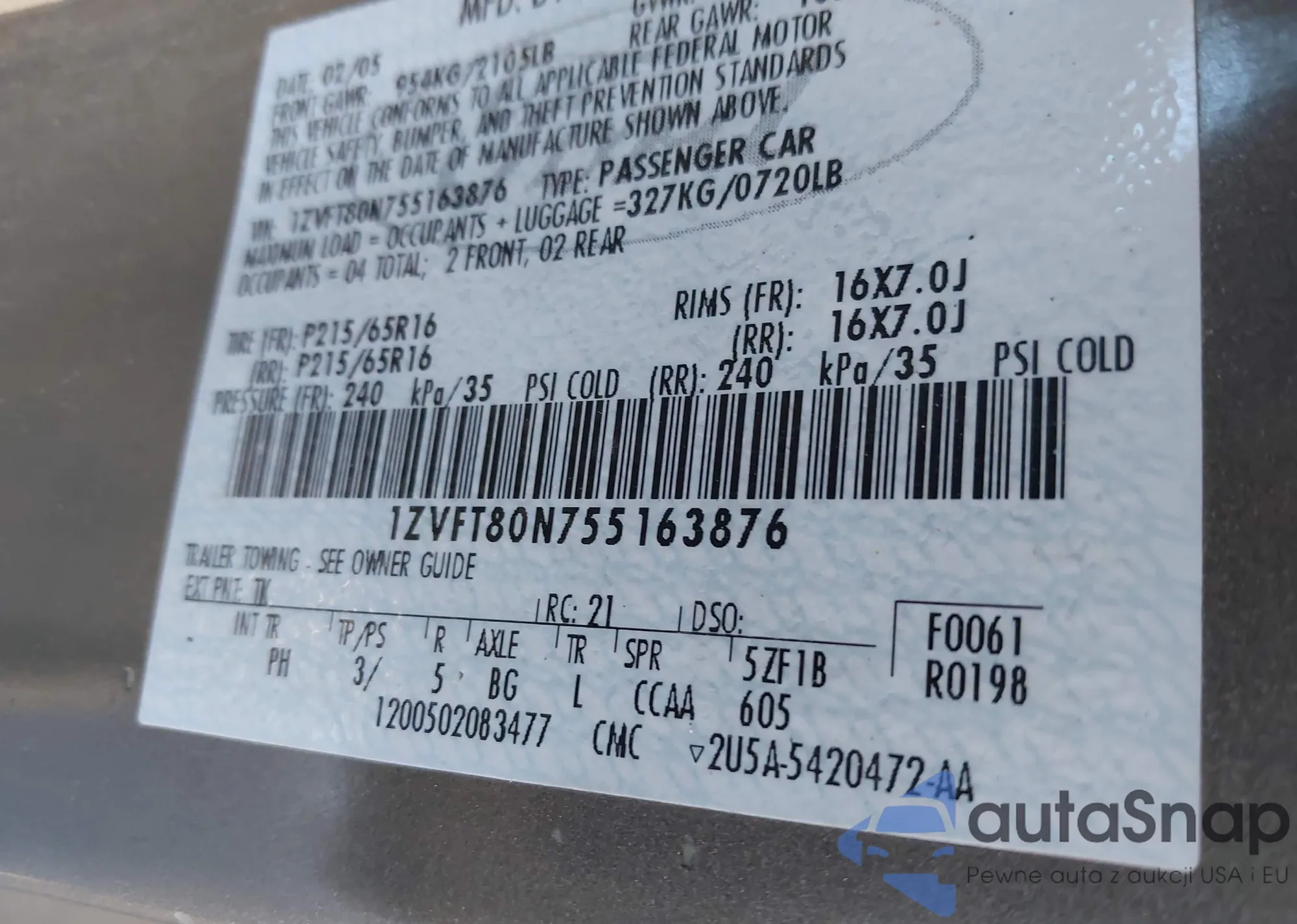 • VIN 1ZVFT80N755163876