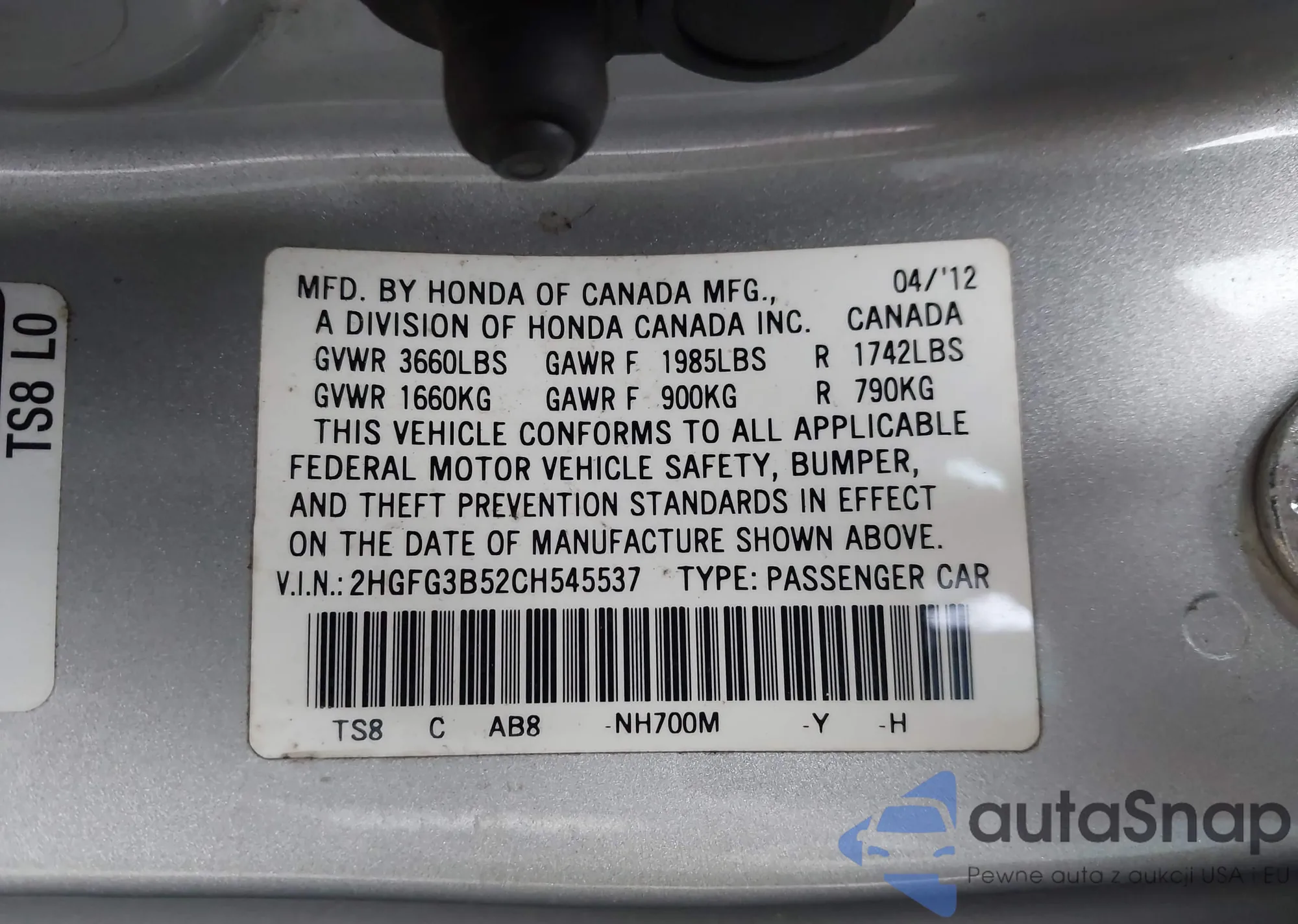 2012 Honda Civic Lx z USA, uszkodzony, nr VIN 2HGFG3B52CH545537
