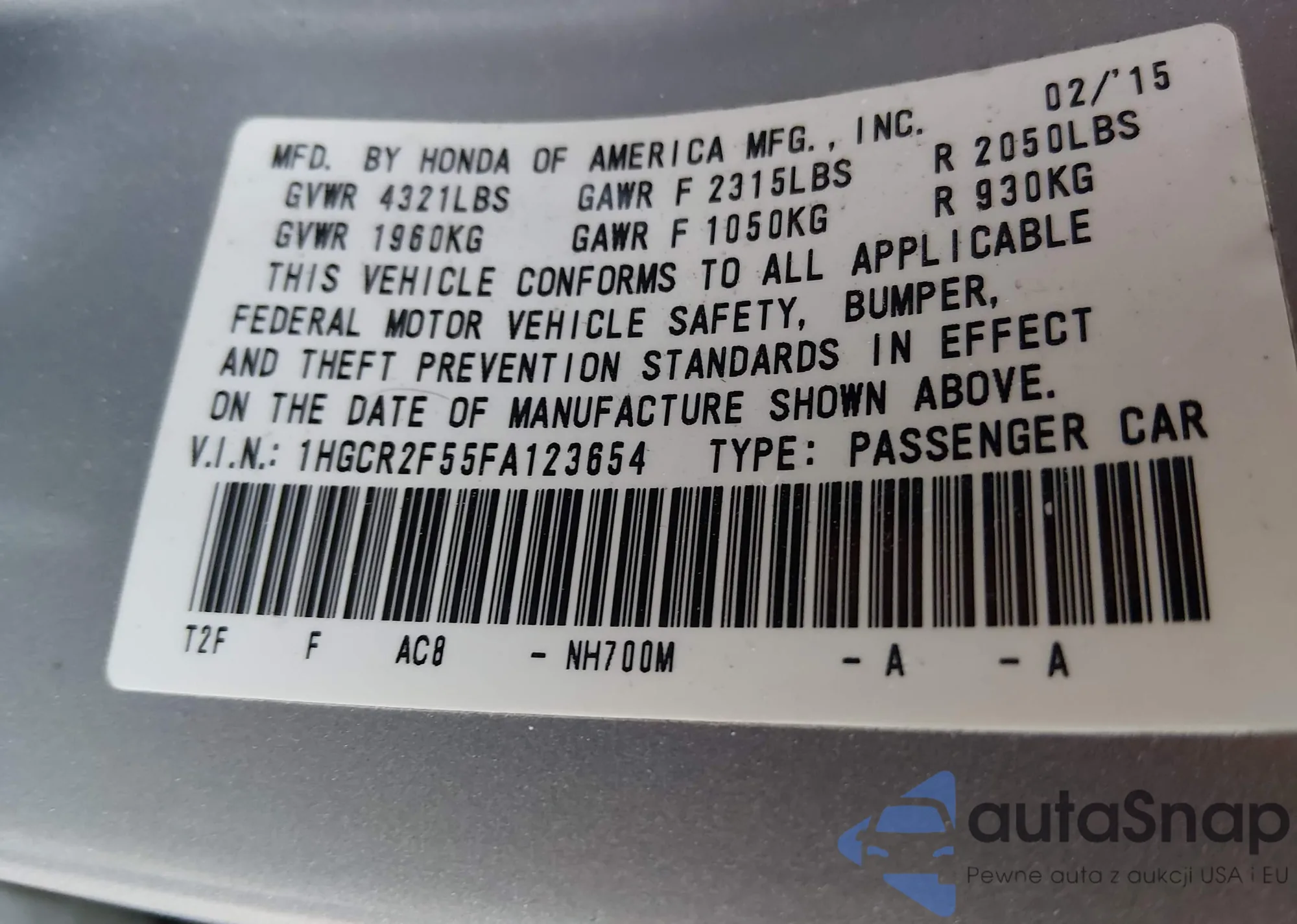 LOT: 43824513 VIN: 1HGCR2F55FA123654
