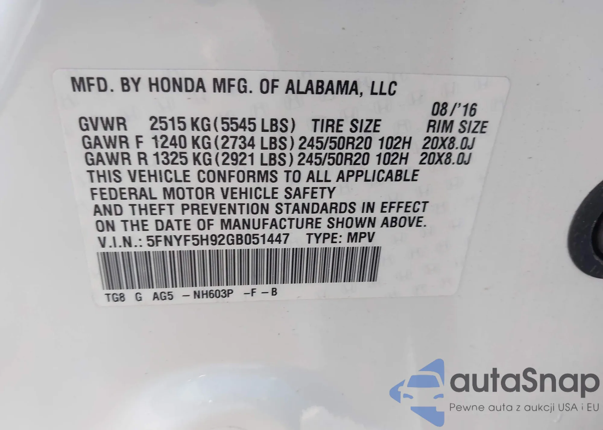 • VIN 5FNYF5H92GB051447
