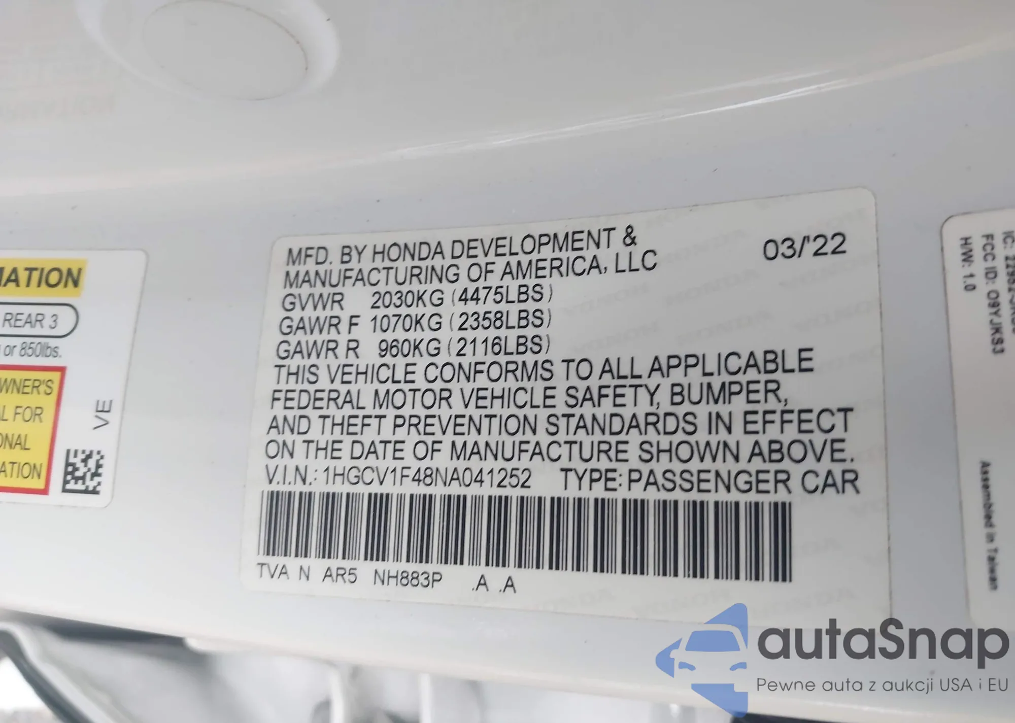 LOT: 44151961 VIN: 1HGCV1F48NA041252
