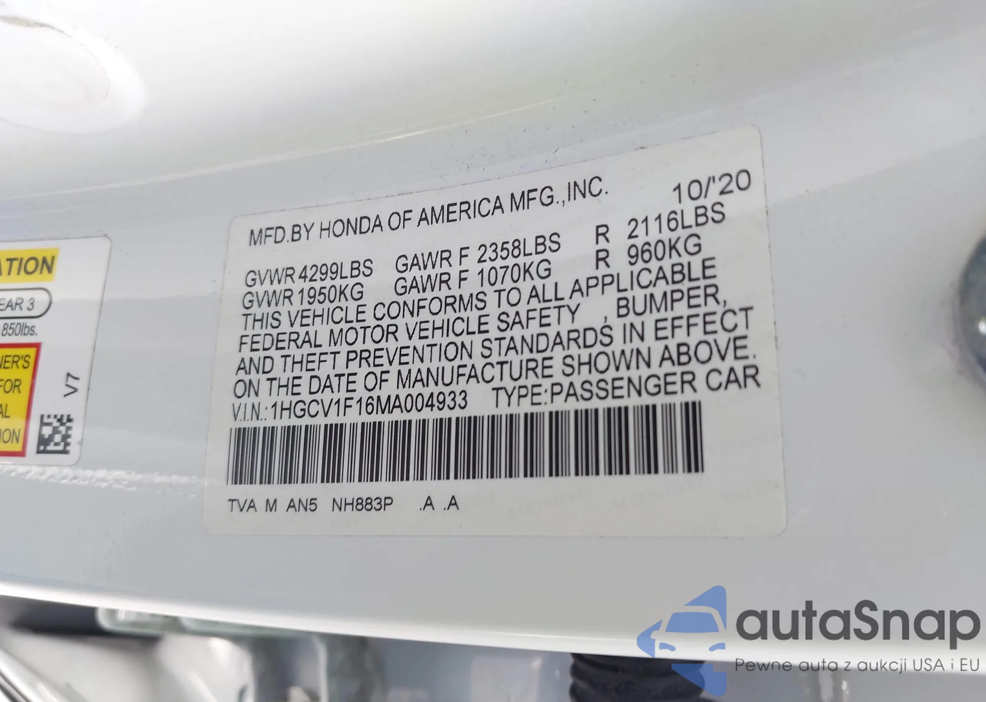 • VIN 1HGCV1F16MA004933