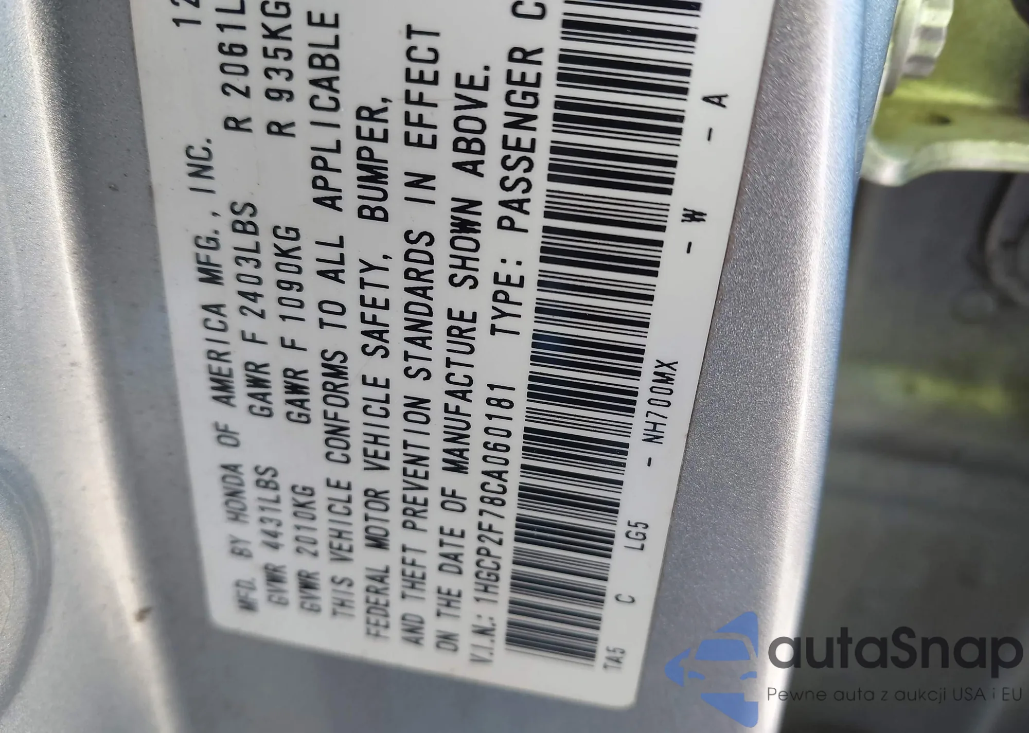 LOT: 44249739 VIN: 1HGCP2F78CA060181