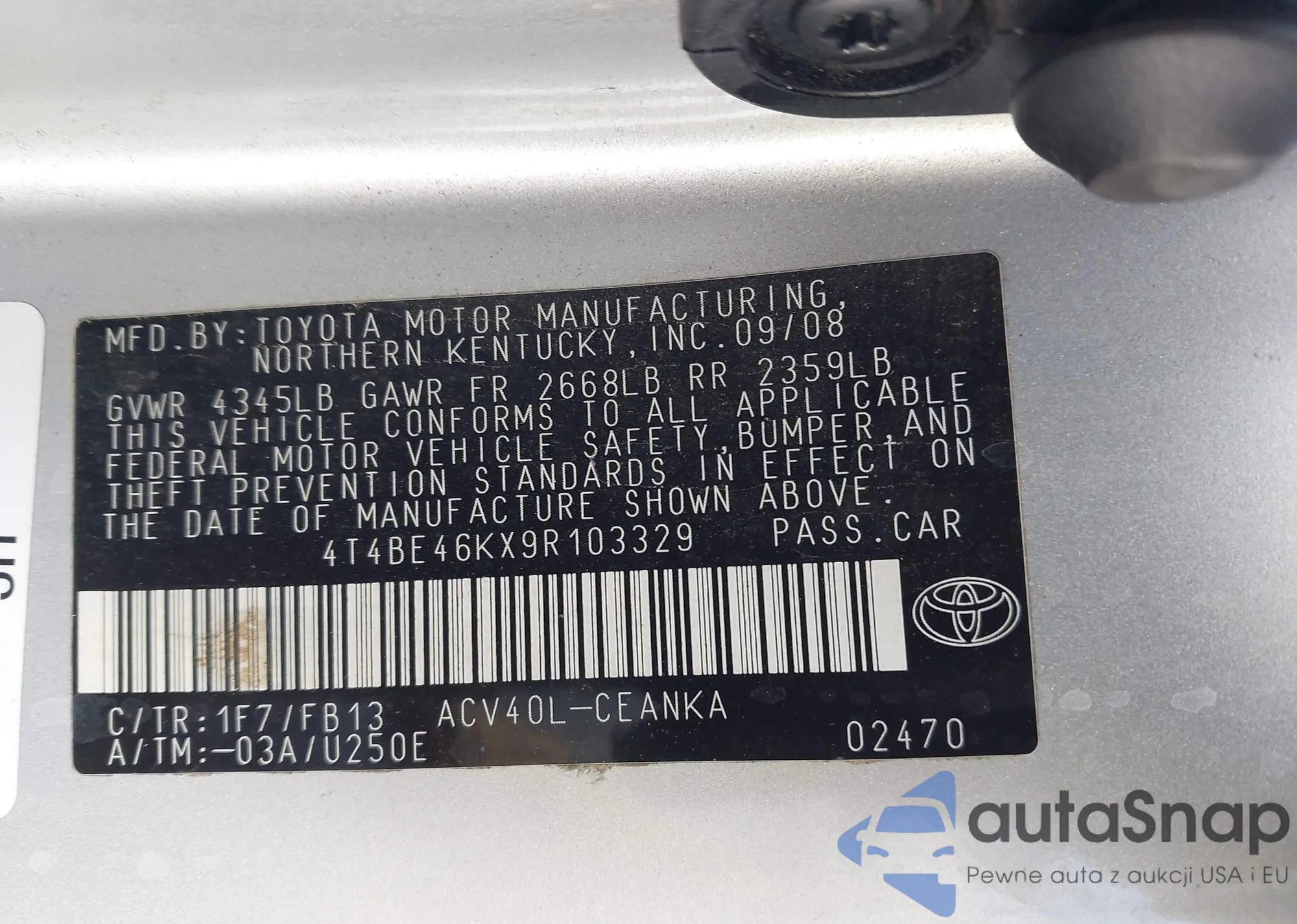 • VIN 4T4BE46K09R050012