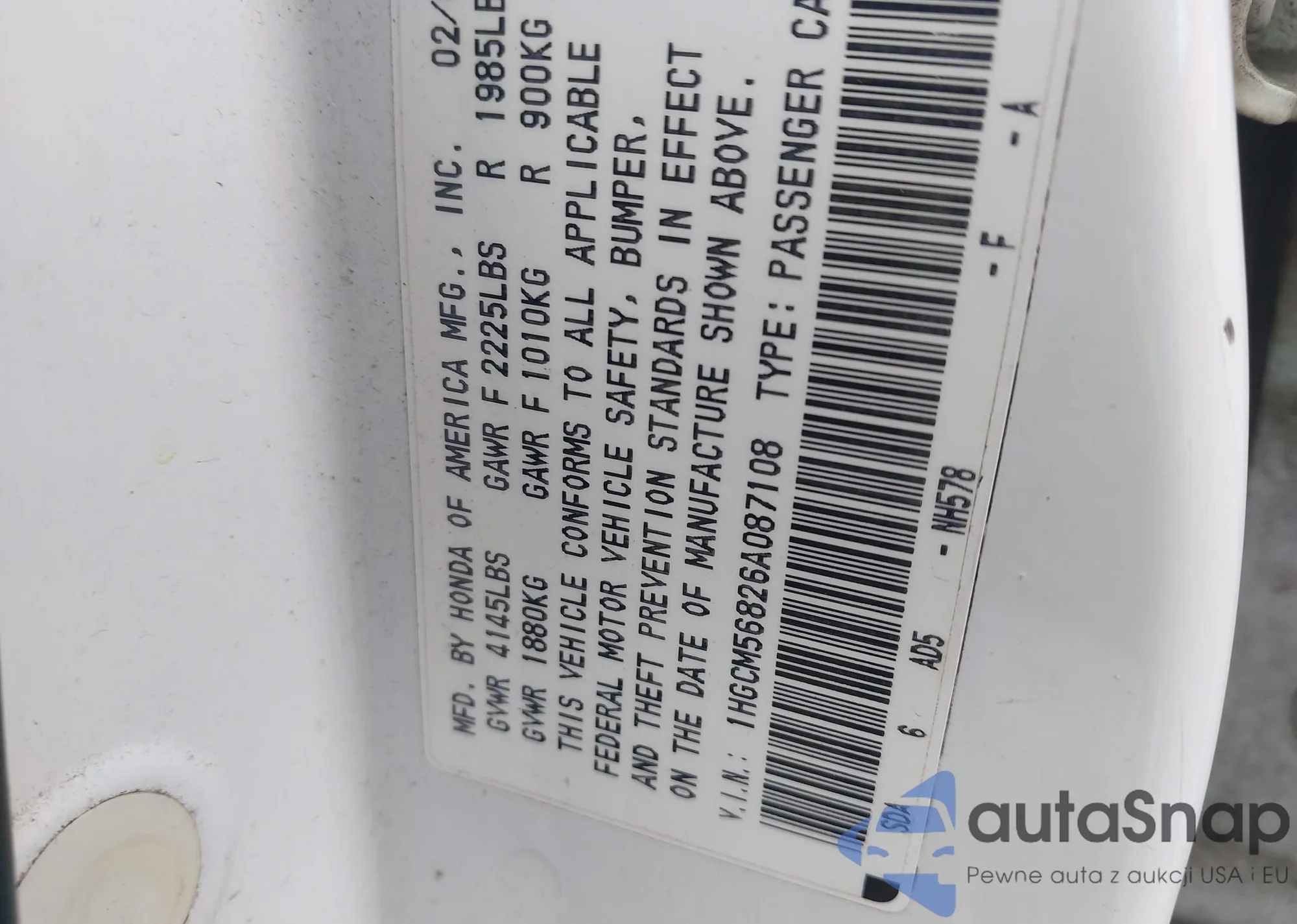 LOT: 44288704 VIN: 1HGCM56826A087108