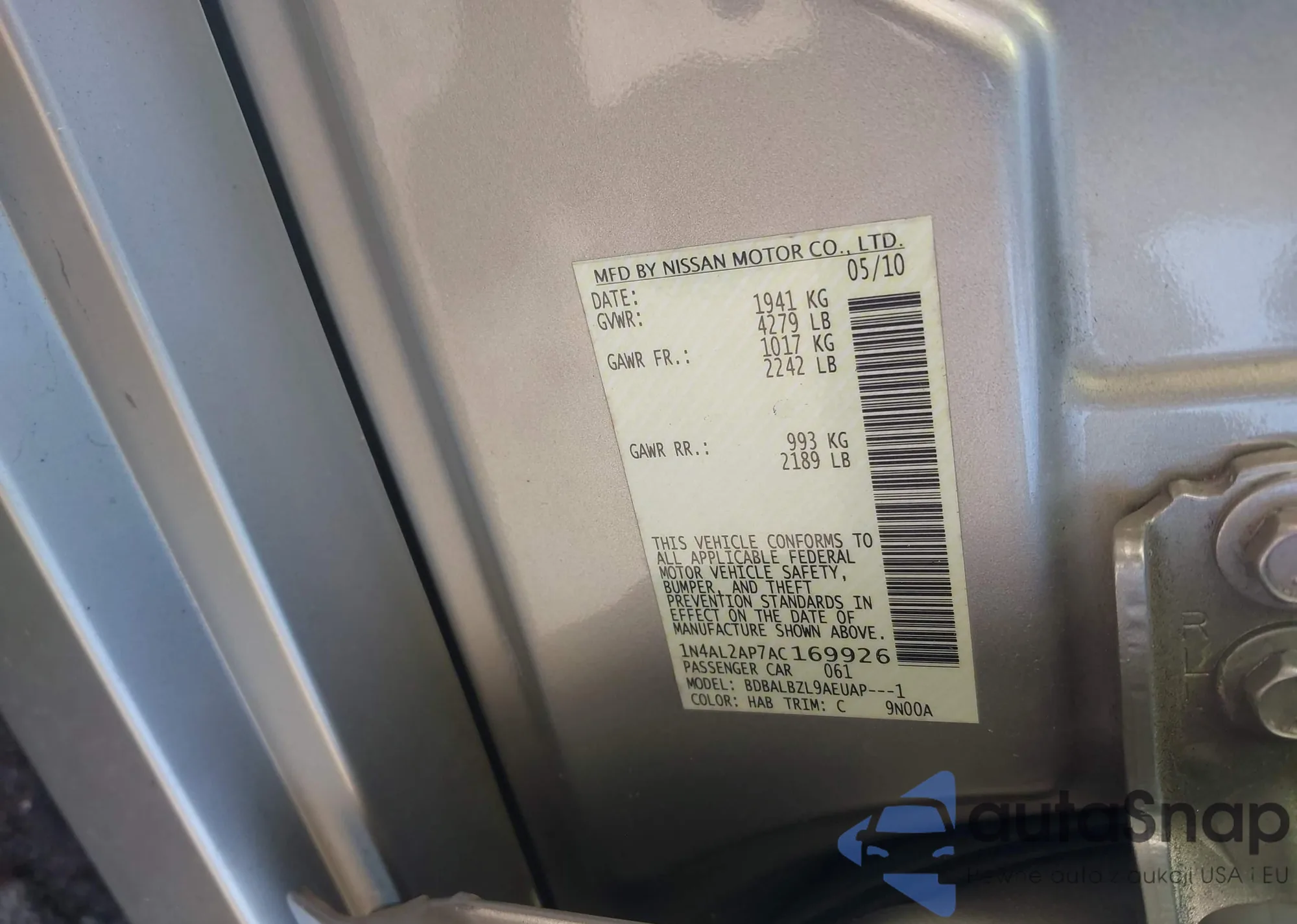 LOT: 44154887 VIN: 1N4AL2AP7AC169926
