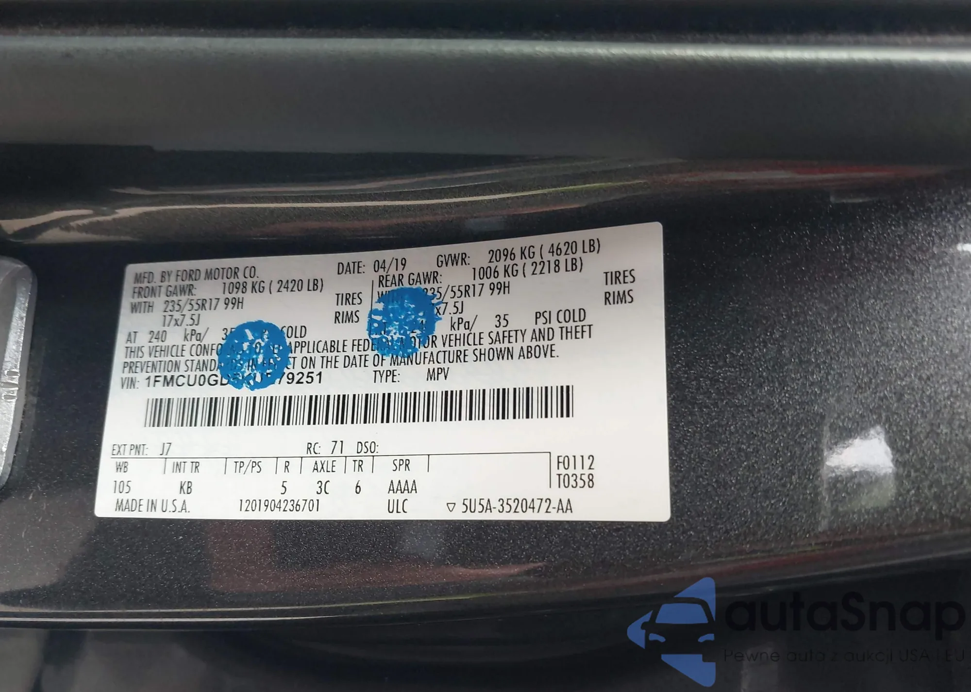 LOT: 44217333 VIN: 1FMCU0GD5KUB79251