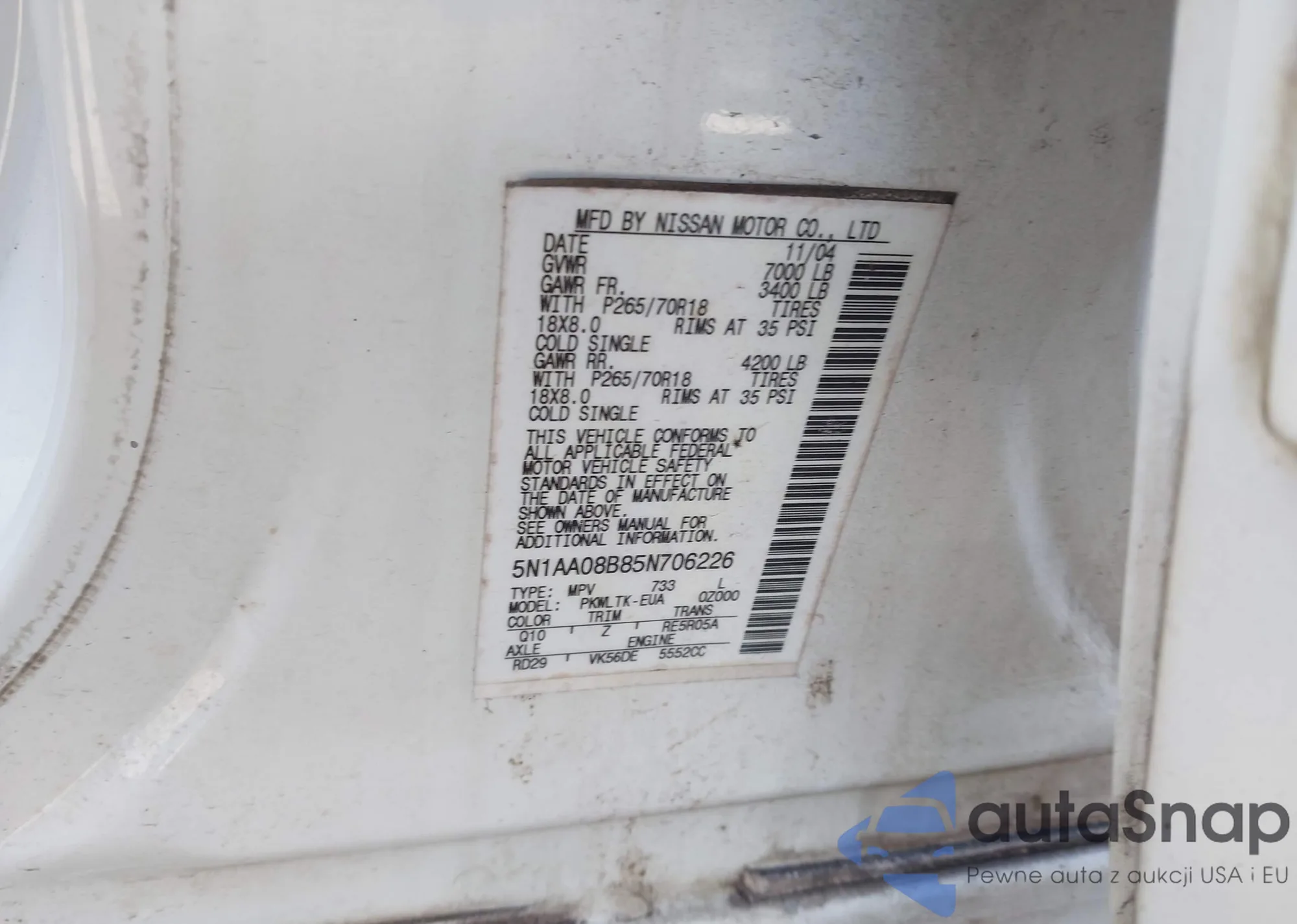 • VIN 5N1AA08B85N706226