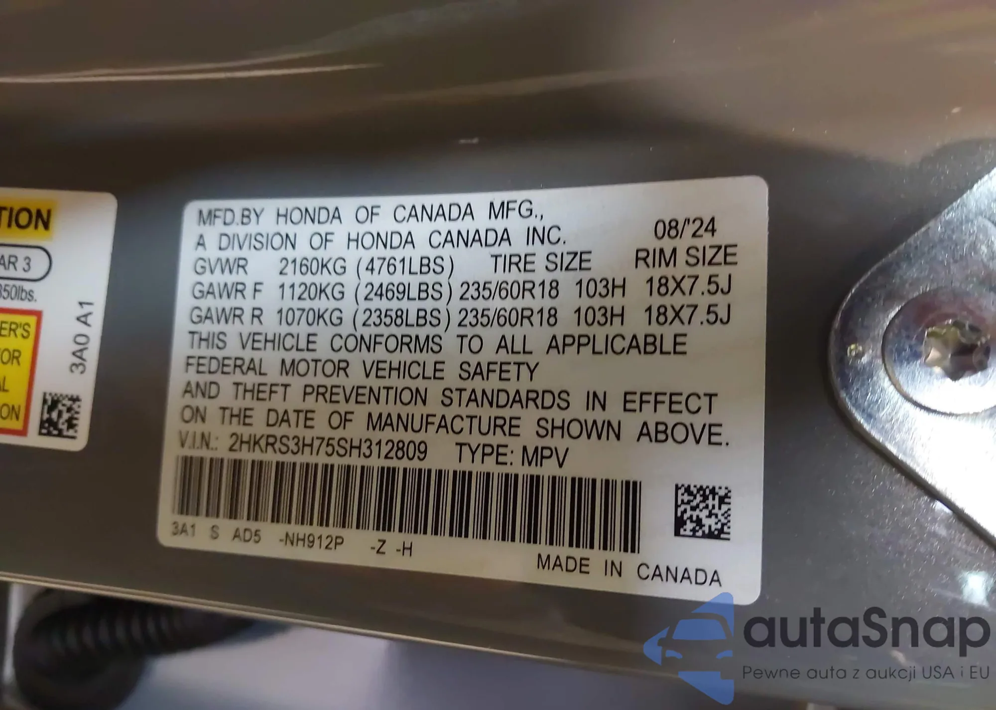 • VIN 2HKRS3H75SH312809
