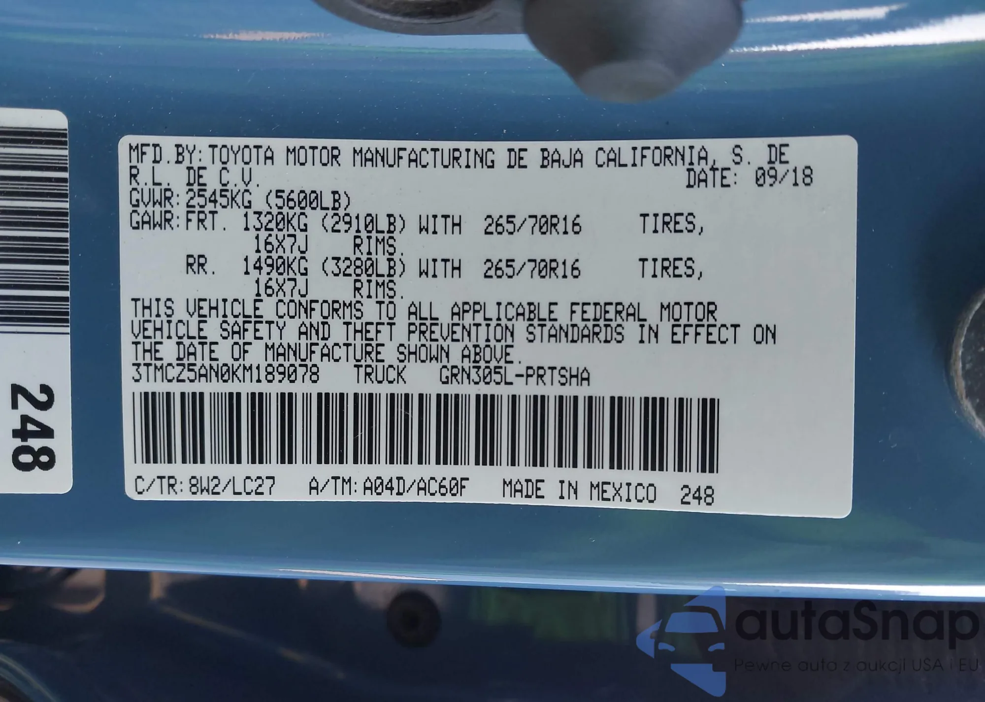 • VIN 3TMCZ5AN0KM189078
