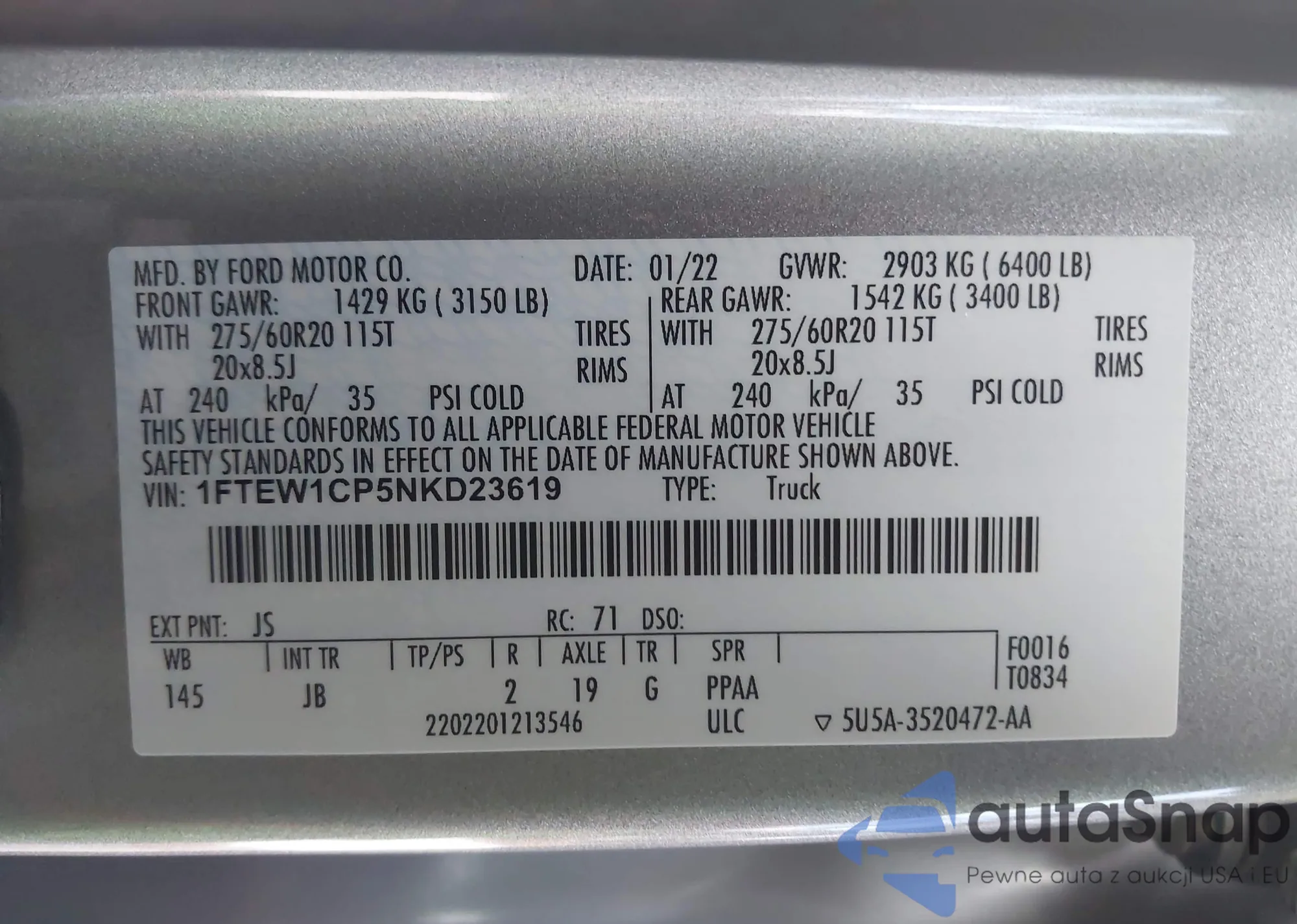 LOT: 43700759 VIN: 1FTEW1CP5NKD23619