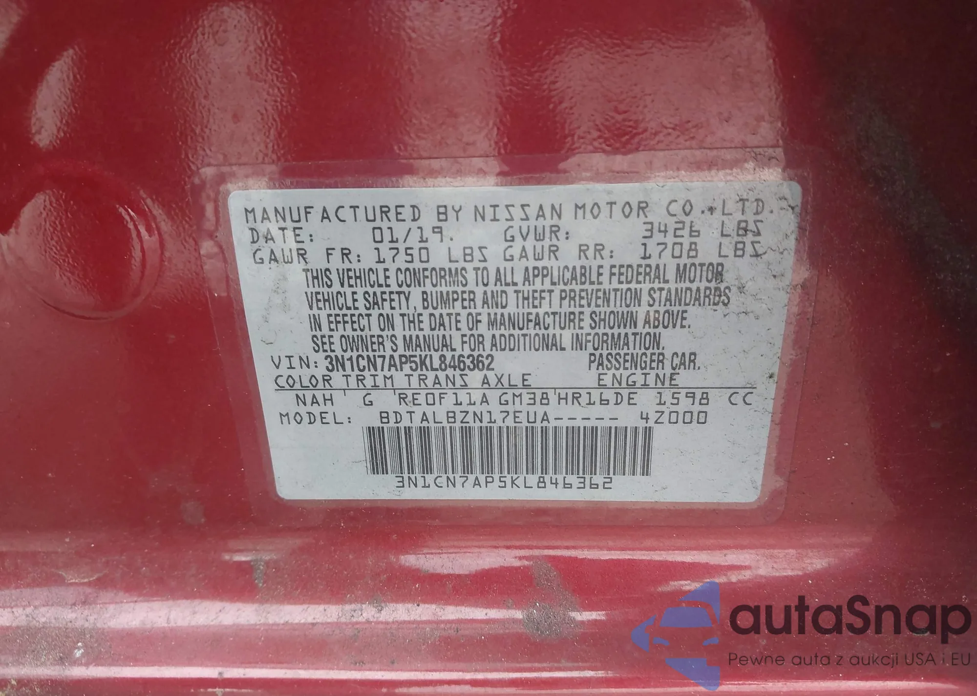 • VIN 3N1CN7AP5KL846362