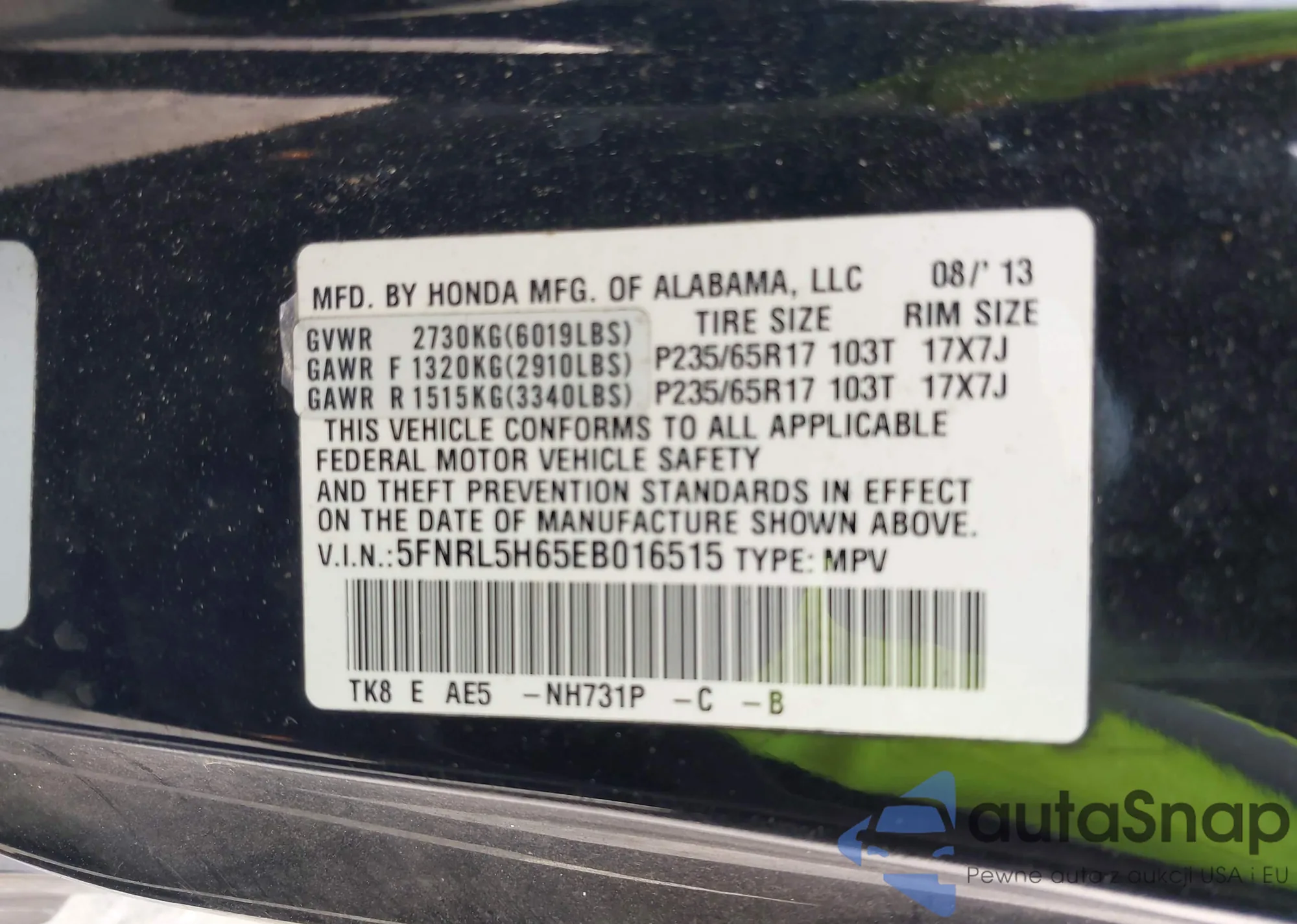 • VIN 5FNRL5H65EB016515