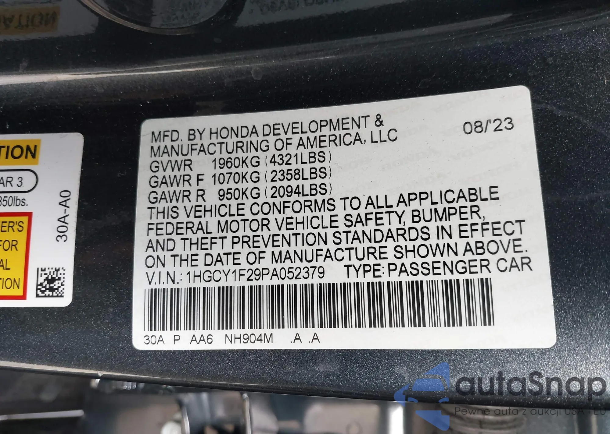 LOT: 43832531 VIN: 1HGCY1F29PA052379
