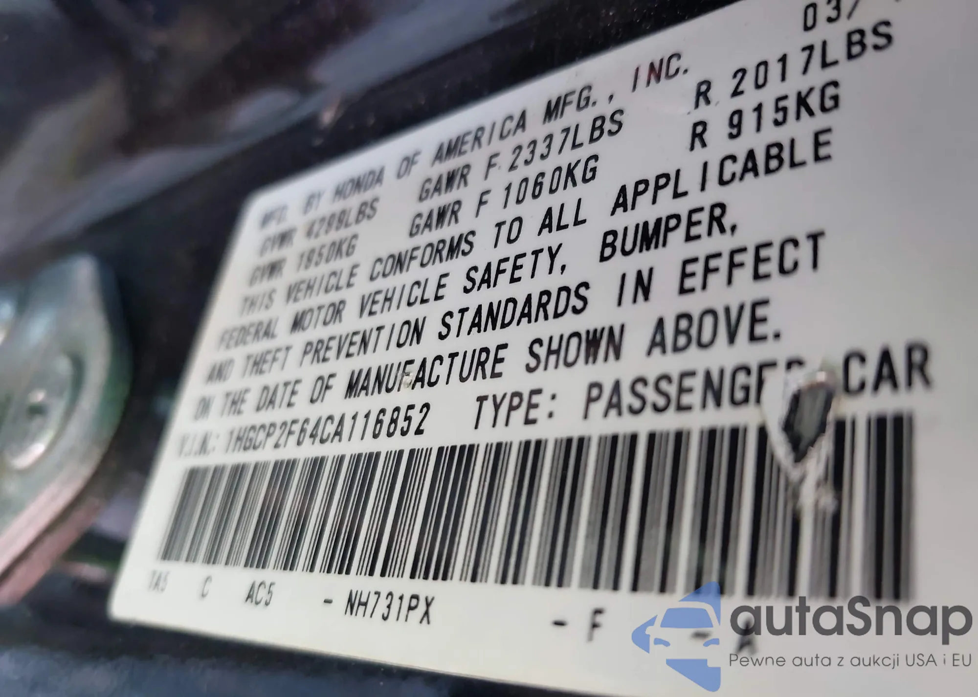 • VIN 1HGCP2F64CA116852