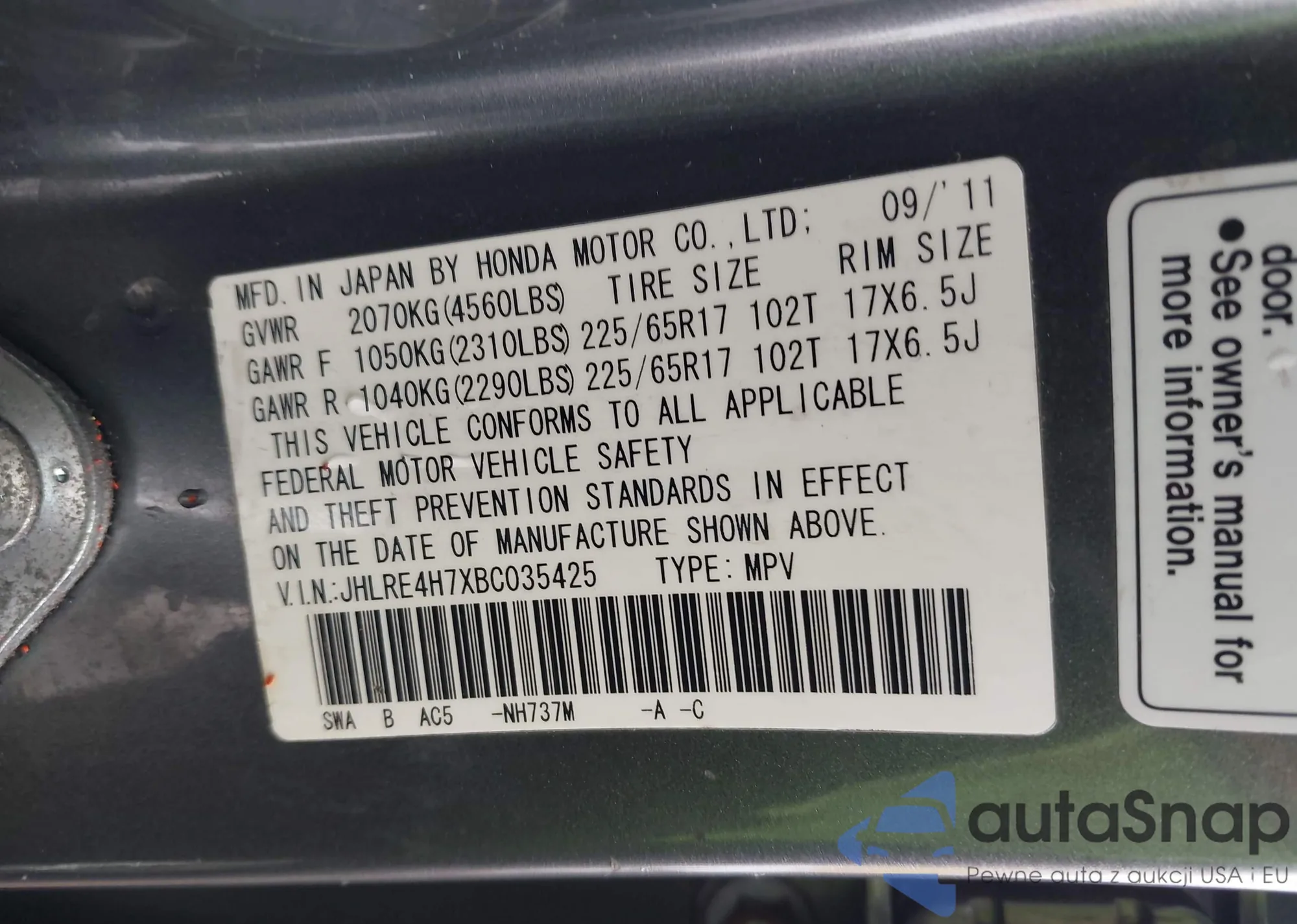 • VIN JHLRE4H7XBC035425