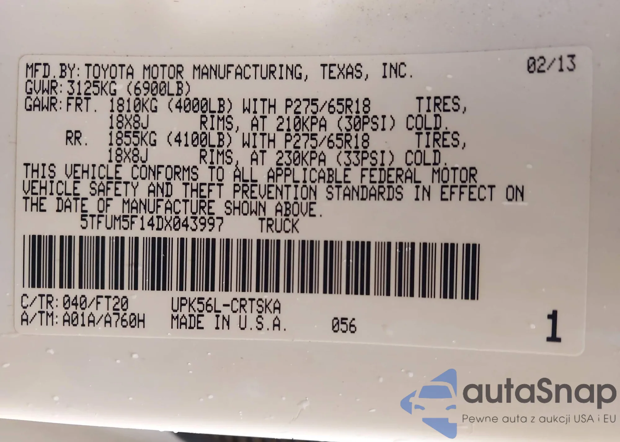 LOT: 43825124 VIN: 5TFUM5F14DX043997