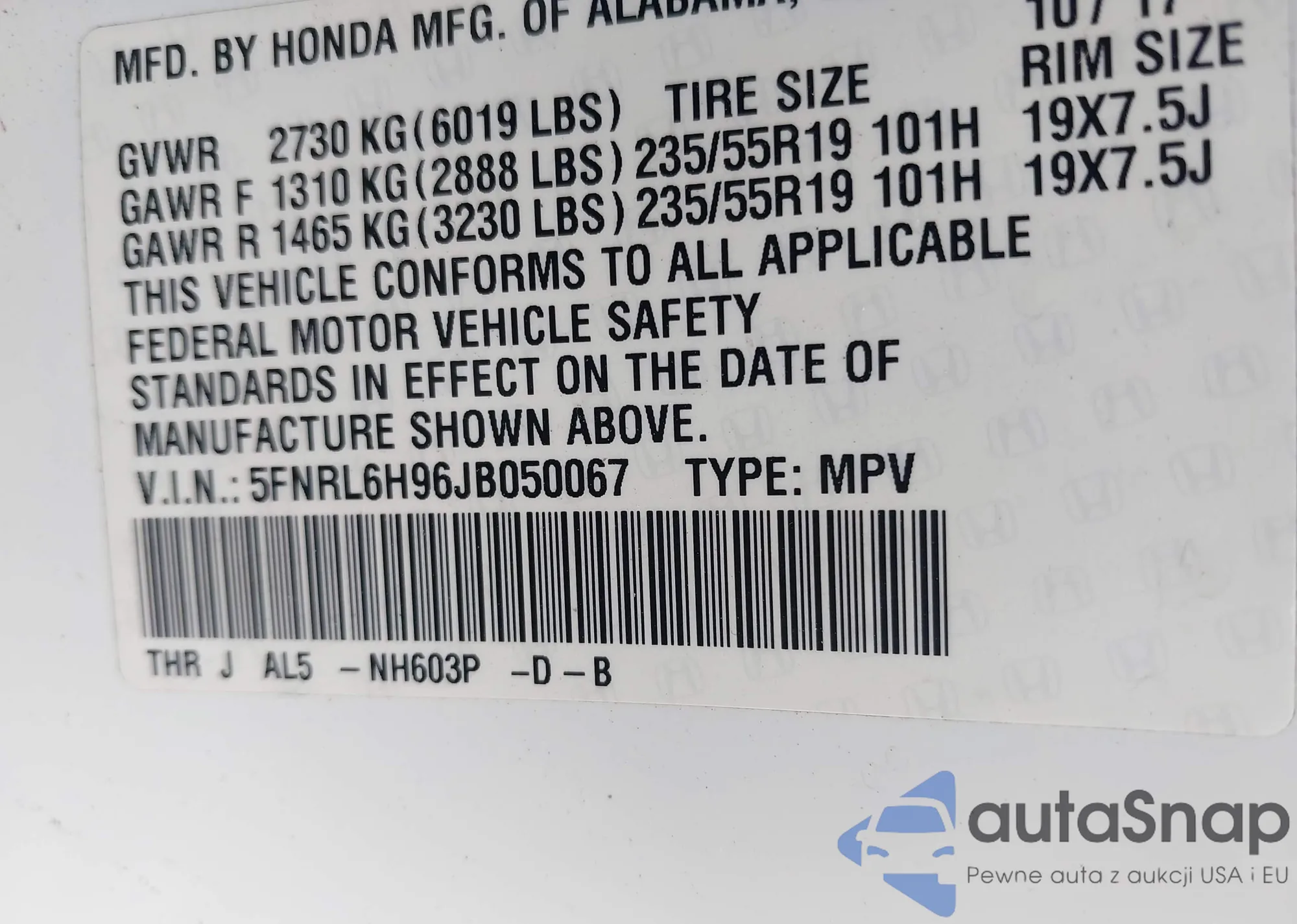 • VIN 5FNRL6H96JB050067