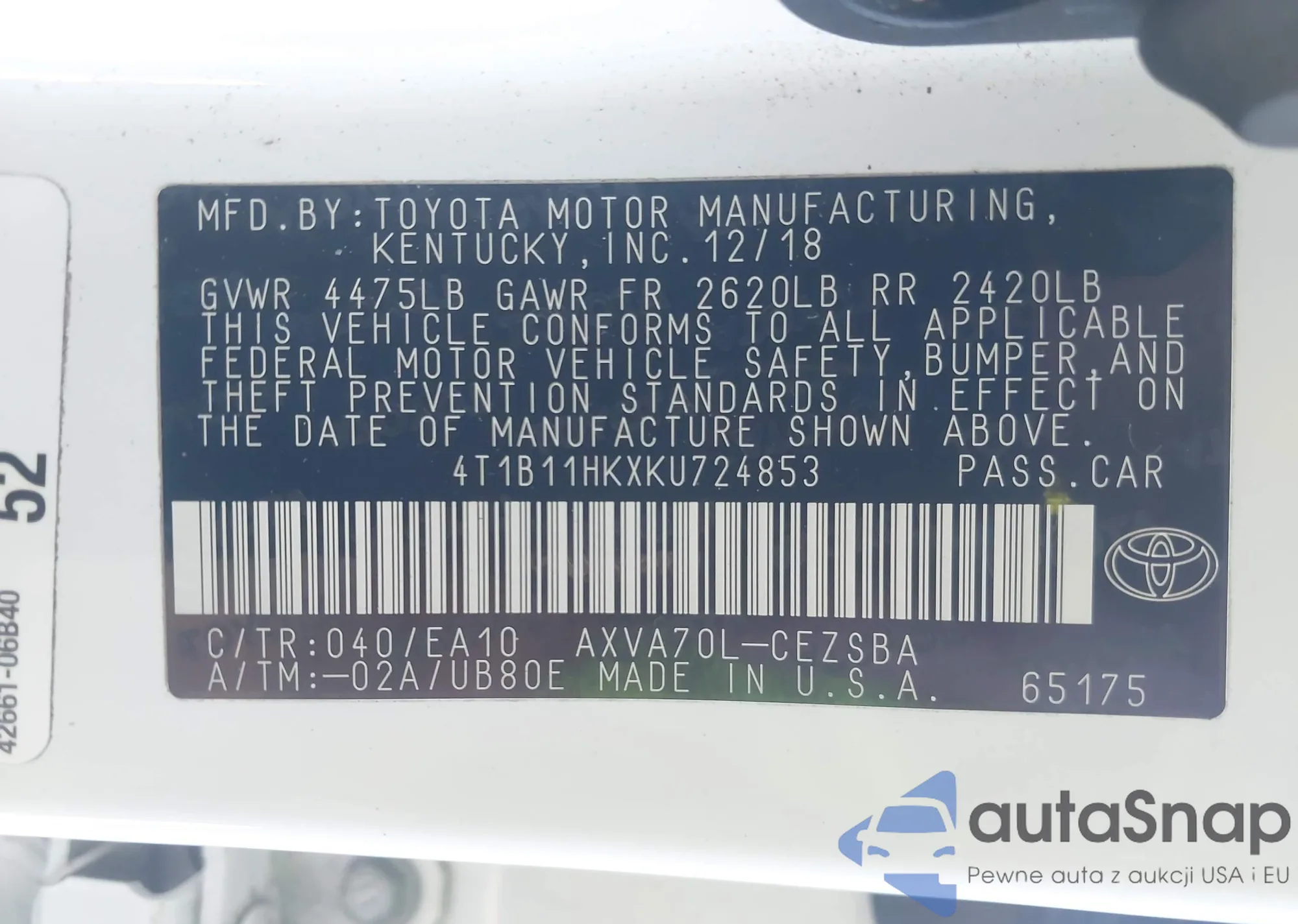 LOT: 44287477 VIN: 4T1B11HKXKU724853