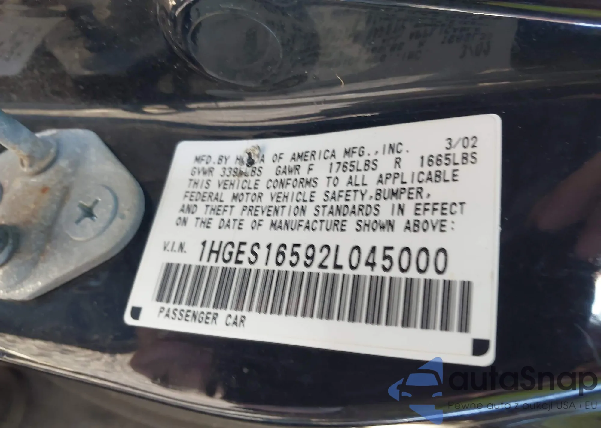 LOT: 44184338 VIN: 1HGES16592L045000