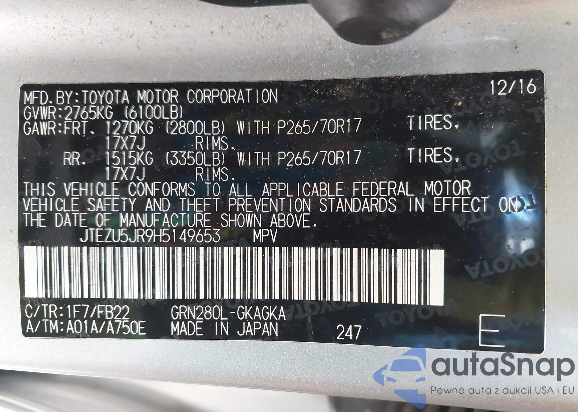 LOT: 44097387 VIN: JTEZU5JR9H5149653