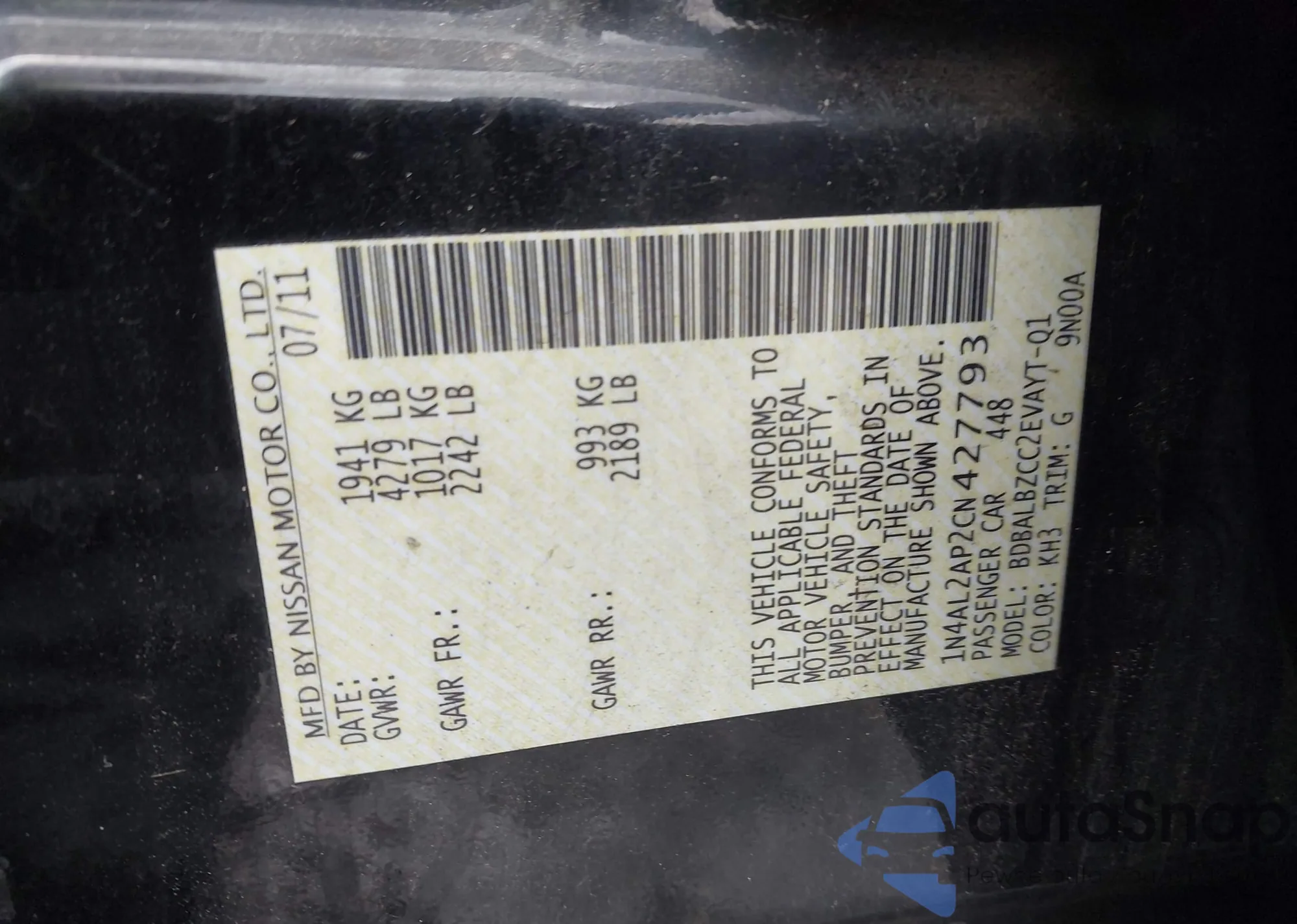 LOT: 43798000 VIN: 1N4AL2AP2CN427793