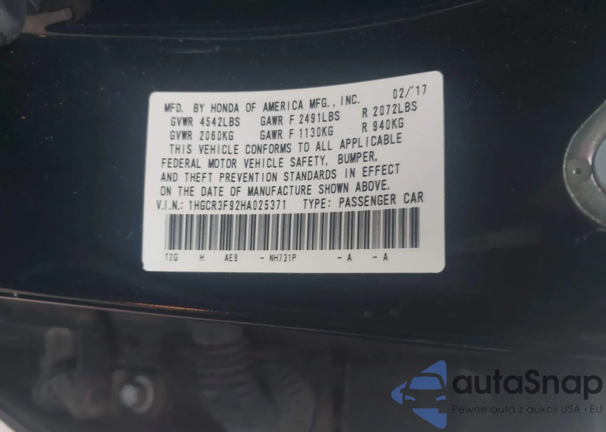 LOT: 44044799 VIN: 1HGCR3F92HA025371