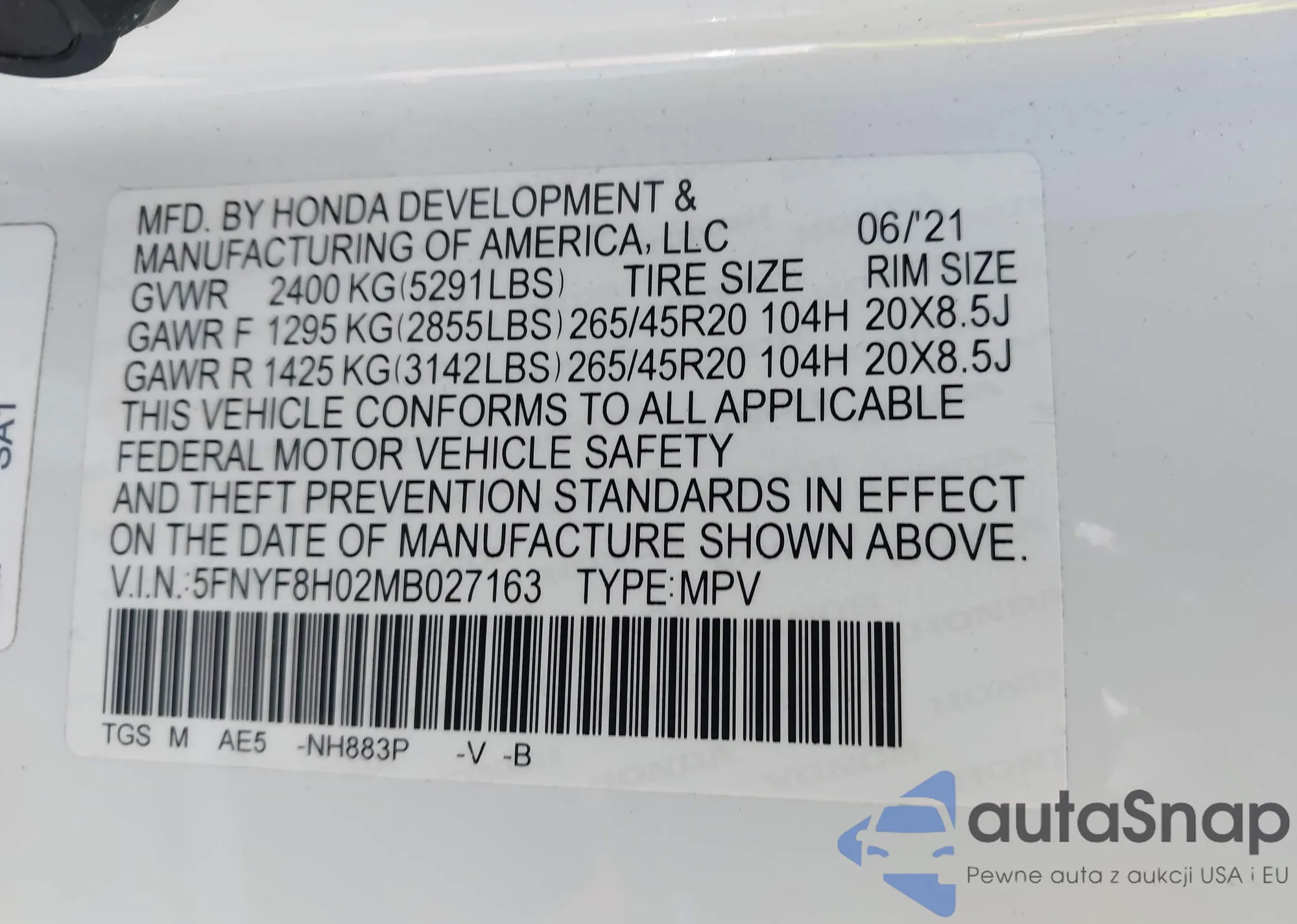 • VIN 5FNYF8H02MB027163