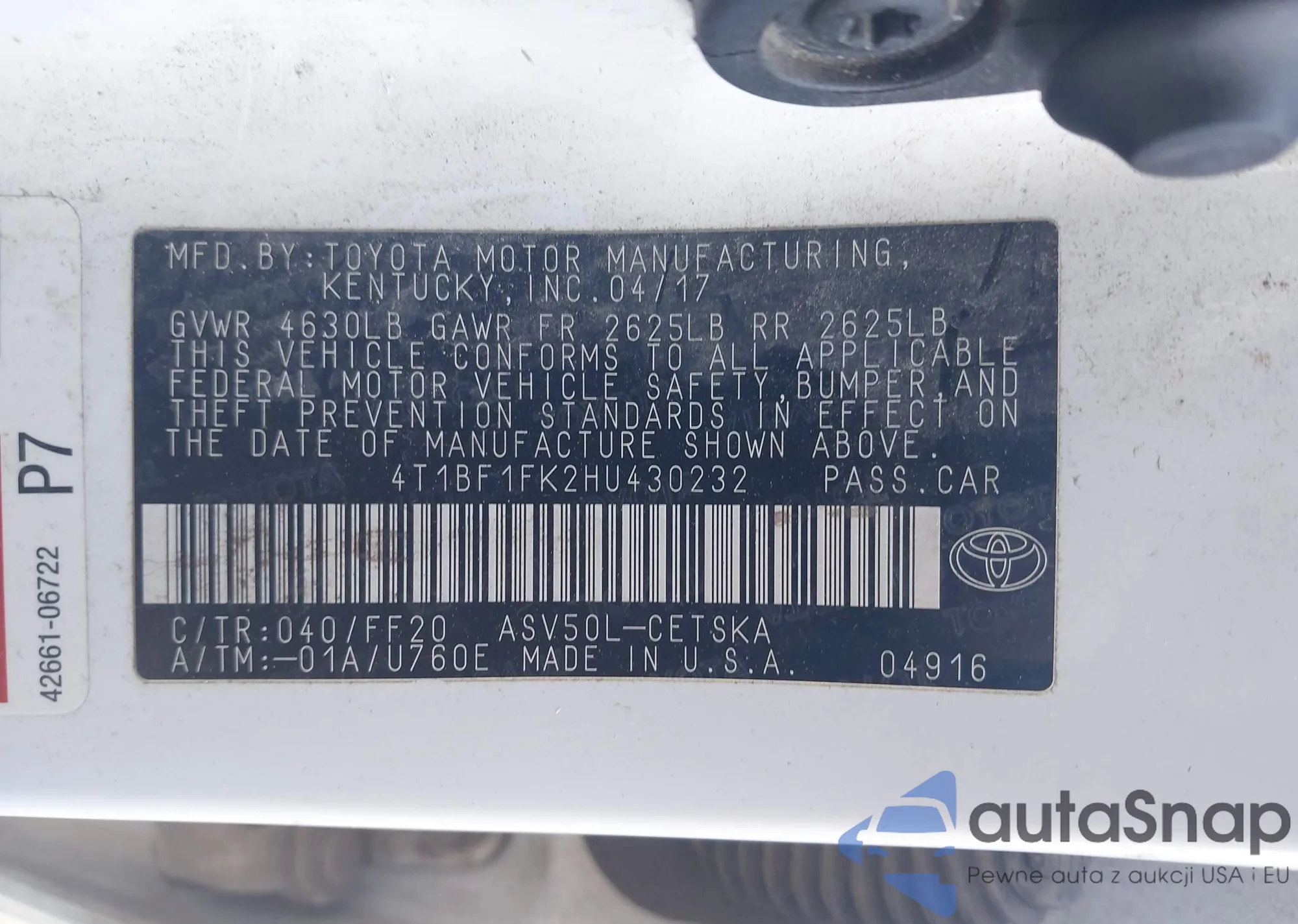 • VIN 4T1BF1FK2HU430232
