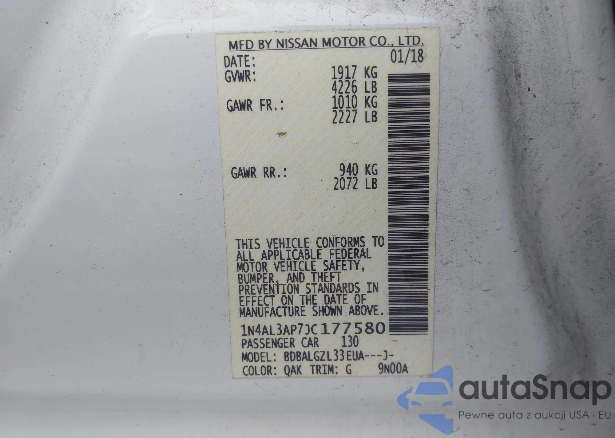 LOT: 43298331 VIN: 1N4AL3AP7JC177580