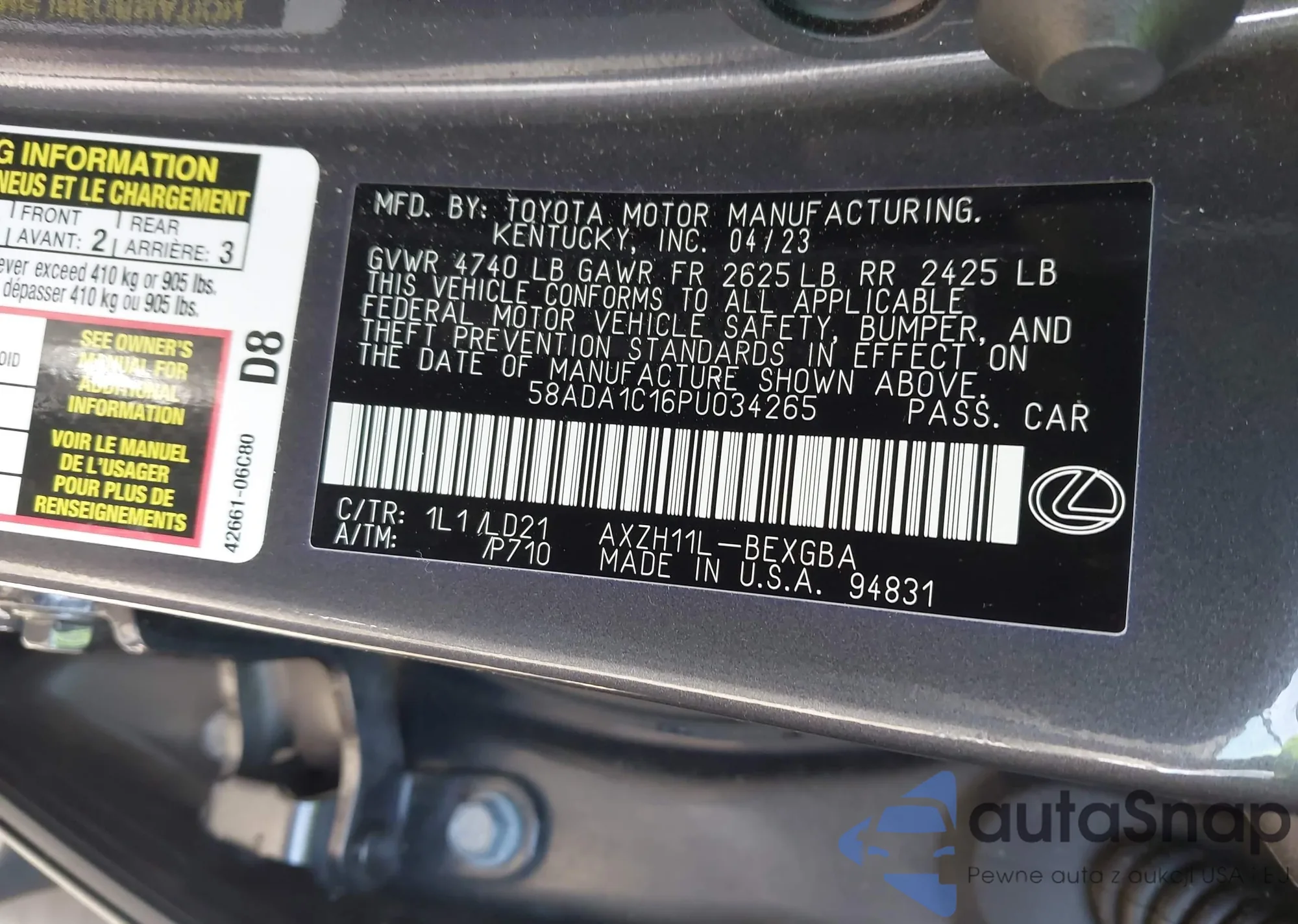 LOT: 44152476 VIN: 1HGCY2F50PA021280