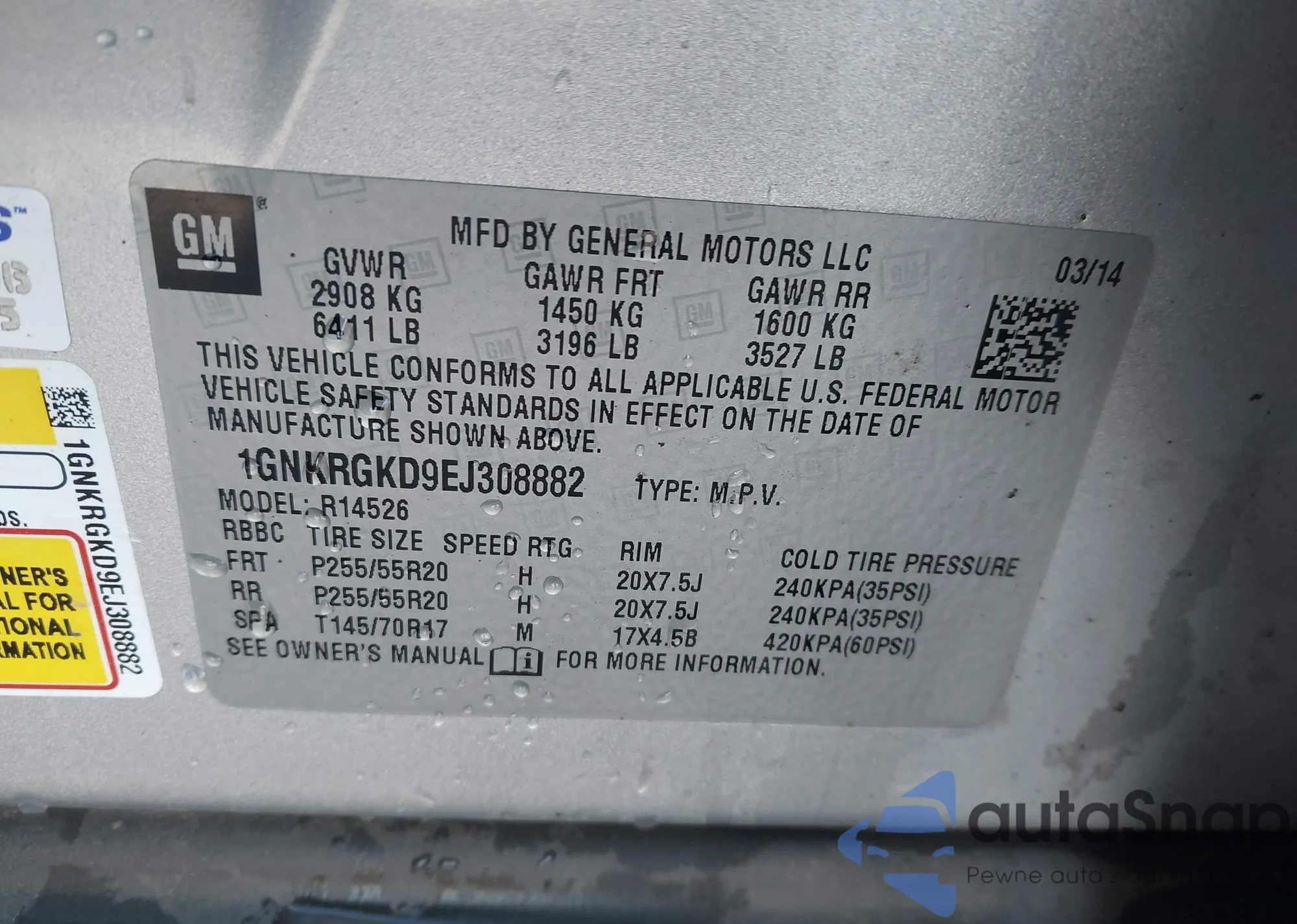 LOT: 43661803 VIN: 1GNKRGKD9EJ308882