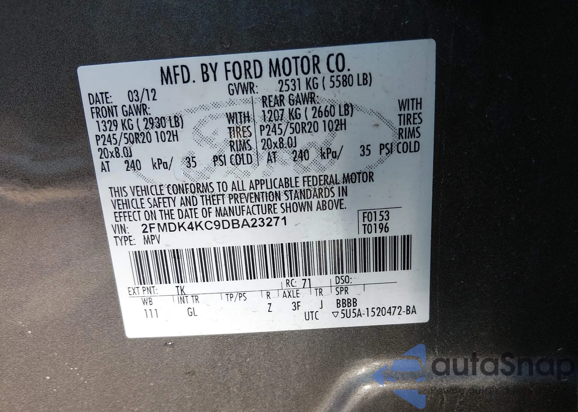 • VIN 2FMDK4KC9DBA23271