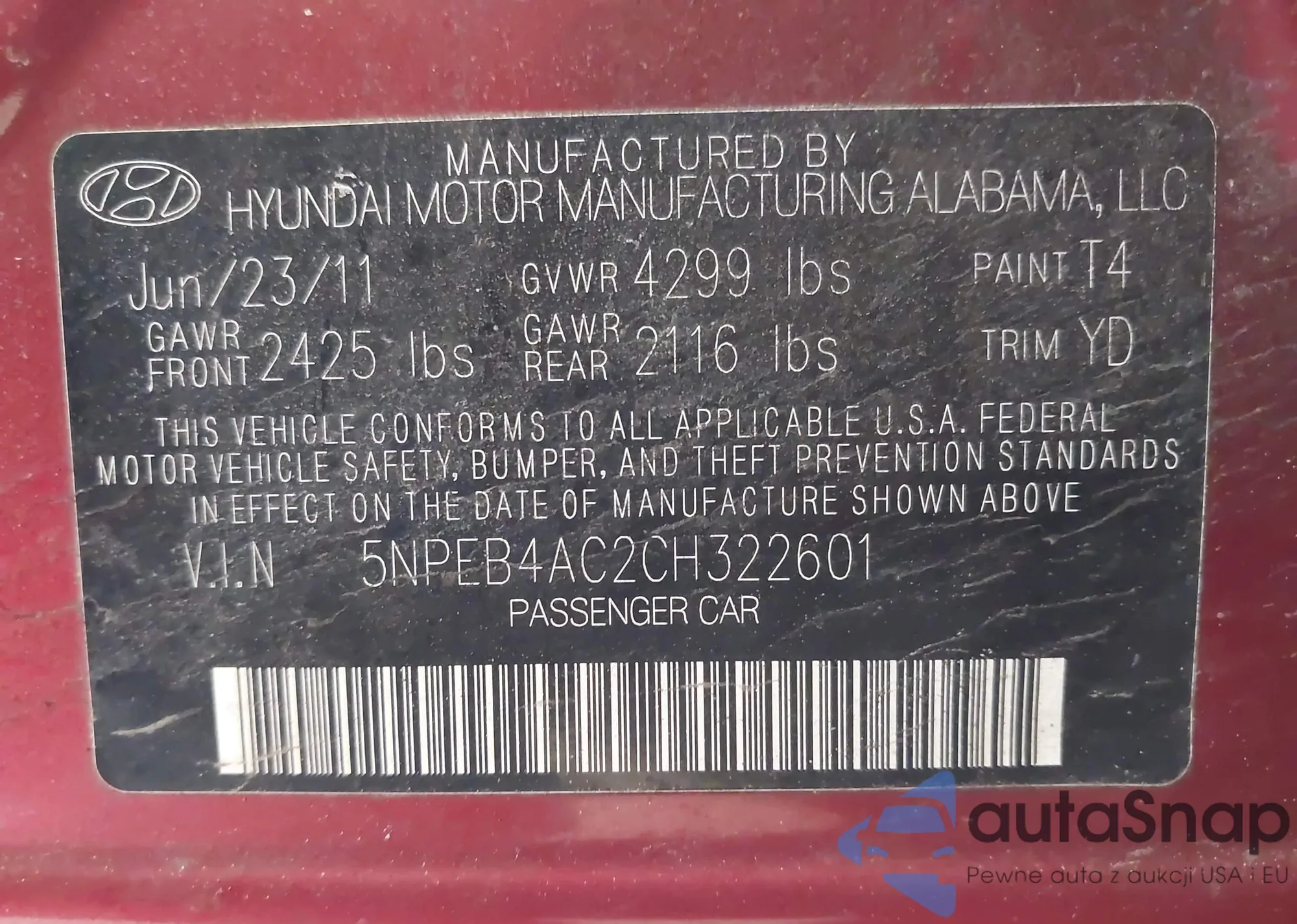 • VIN 5NPEB4AC2CH322601