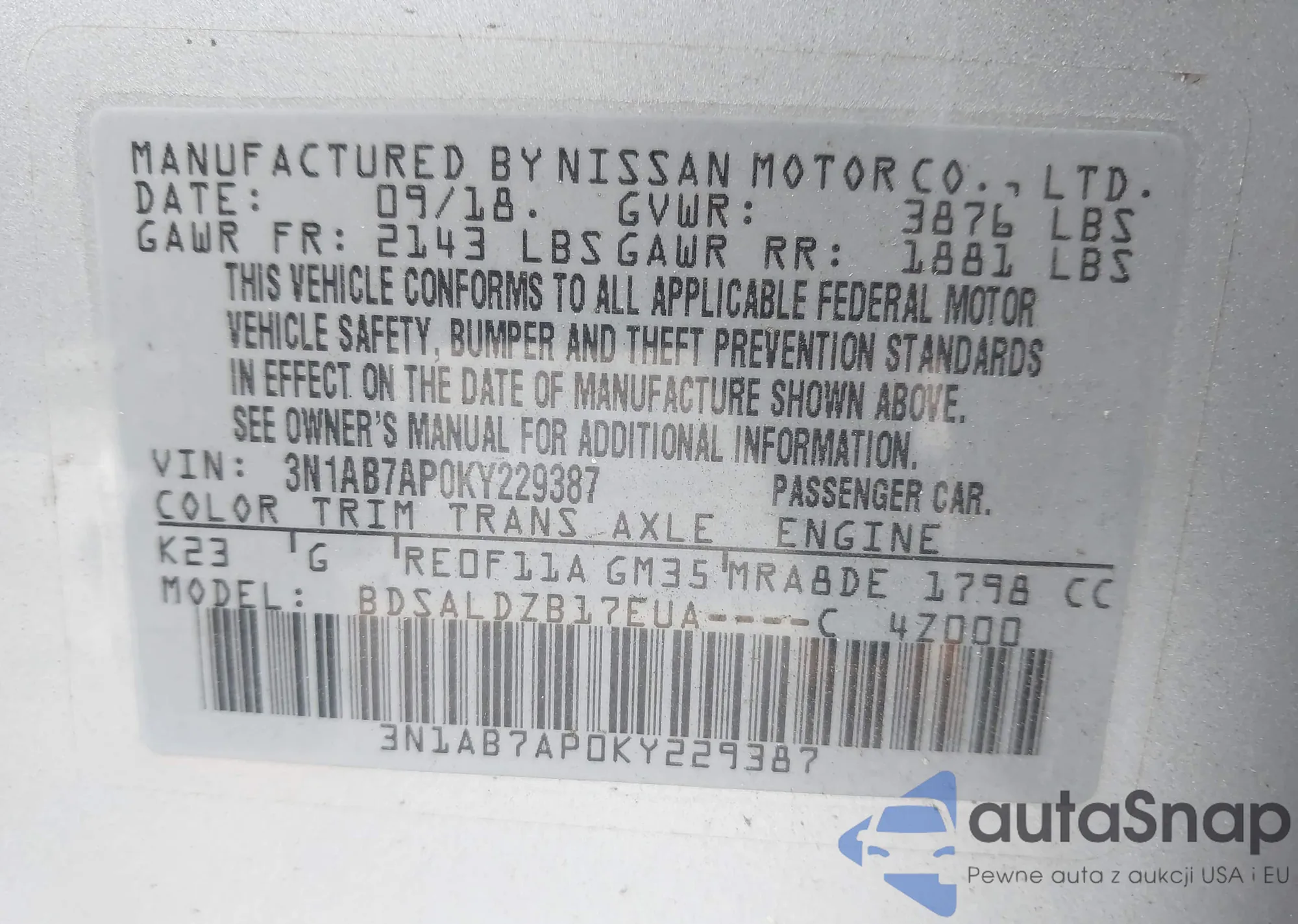 • VIN 3N1AB7AP0KY229387