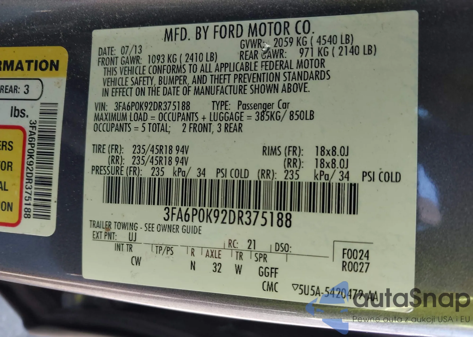 • VIN 5XYZU3LA6DG073018