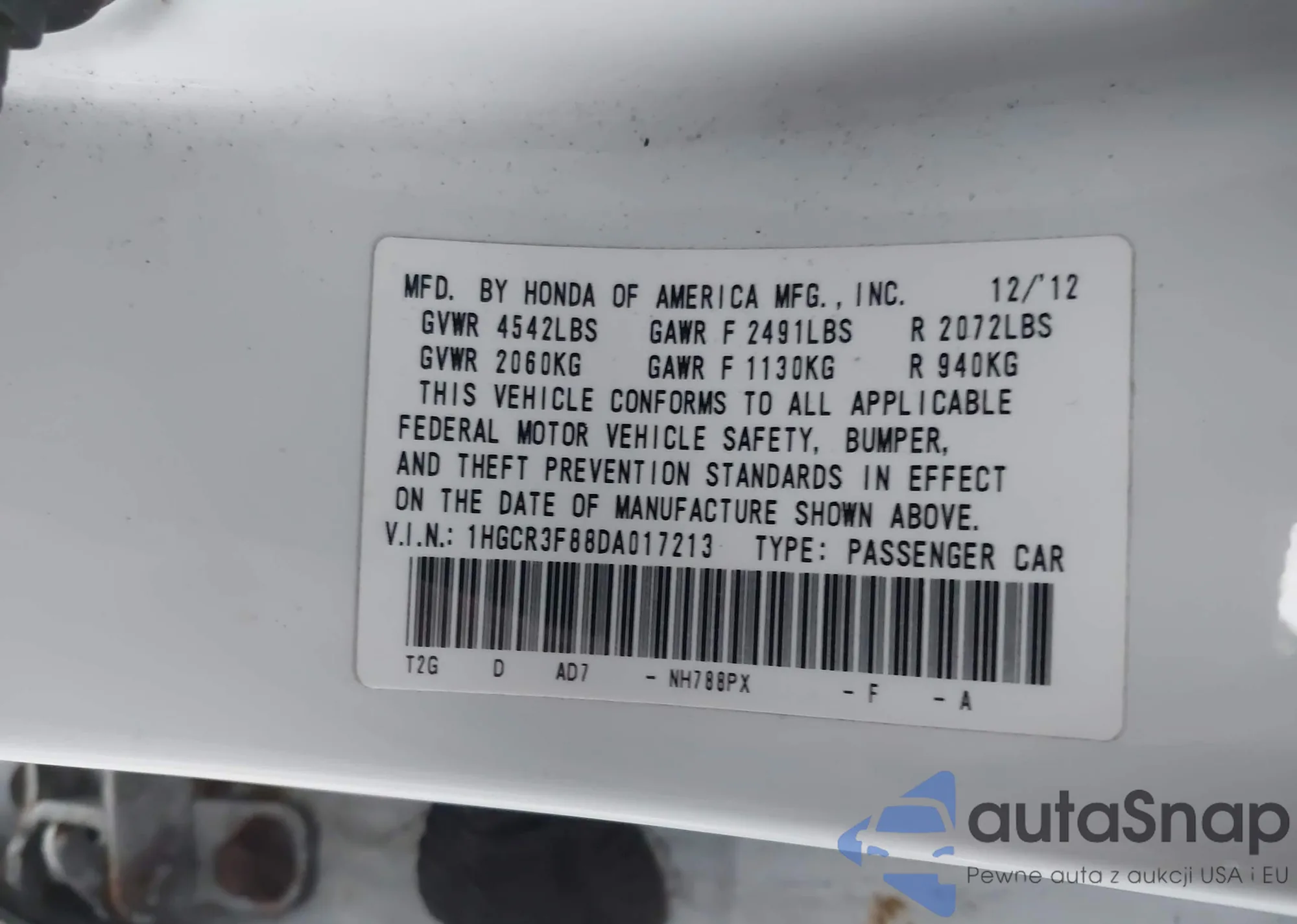 LOT: 44343782 VIN: 1HGCR3F88DA017213