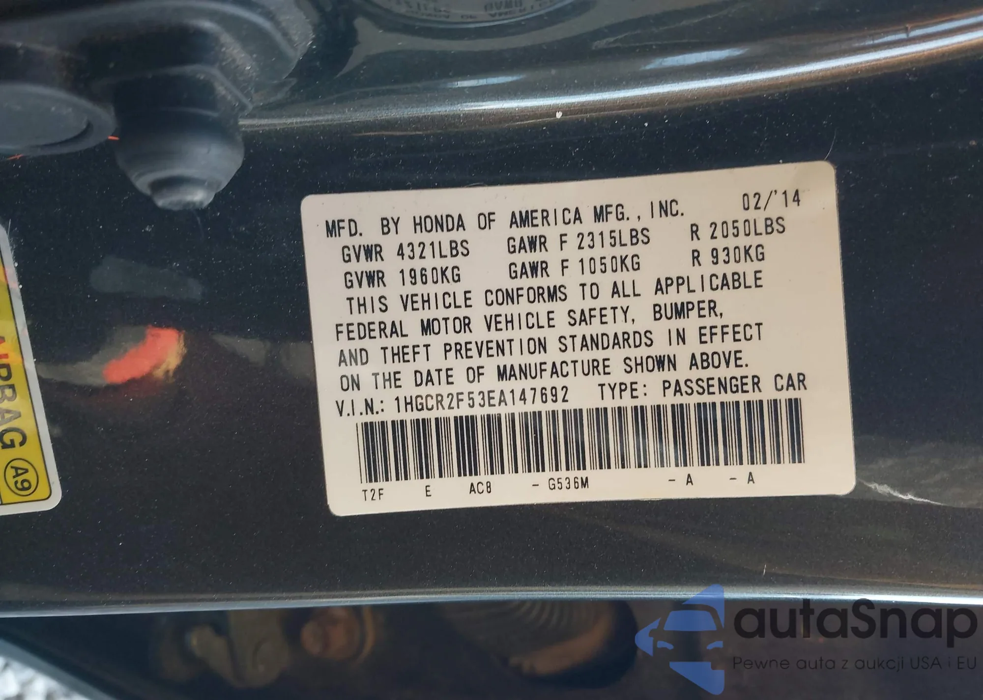 • VIN 1HGCR2F53EA147692