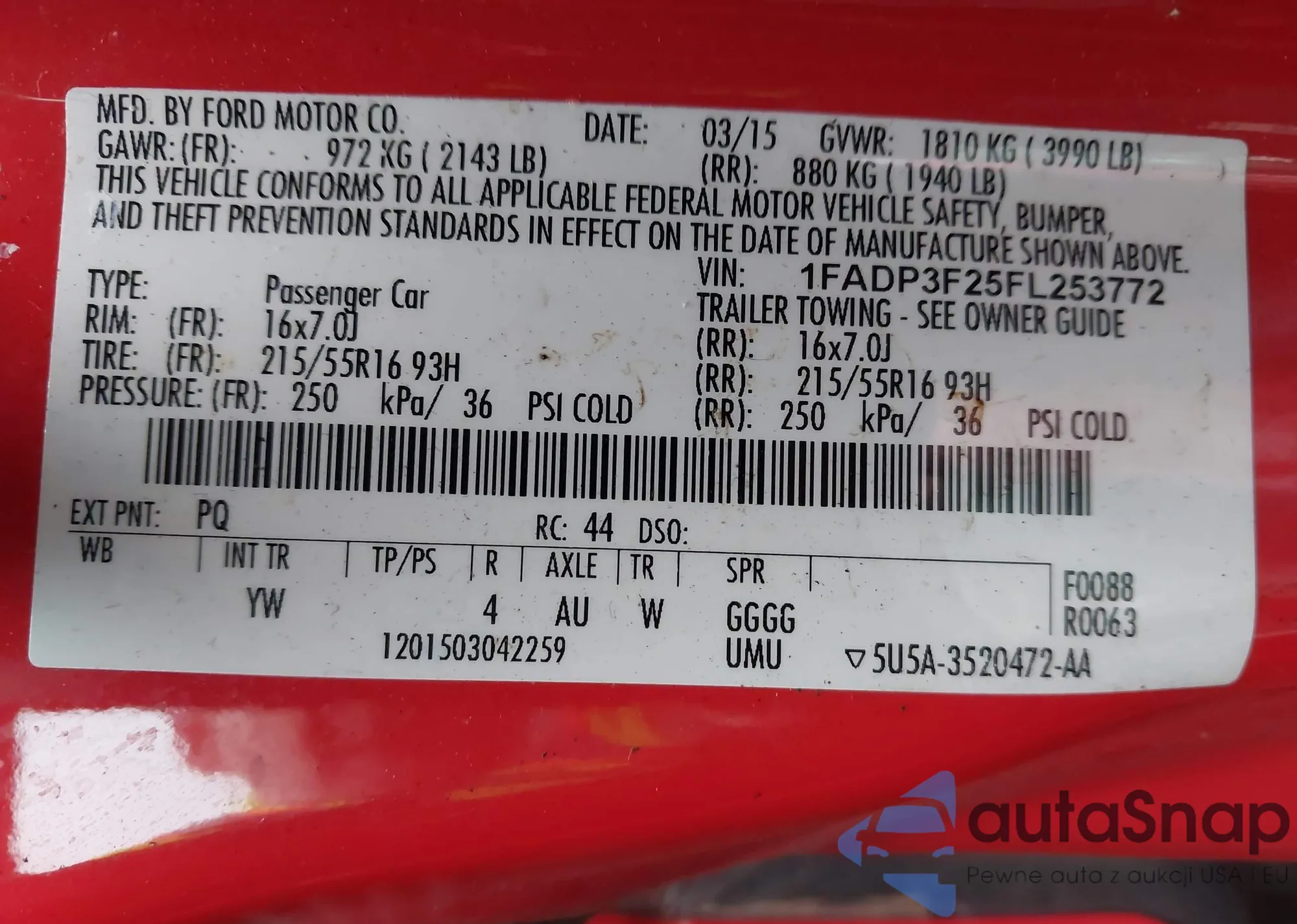 LOT: 44121031 VIN: 1FADP3F25FL253772