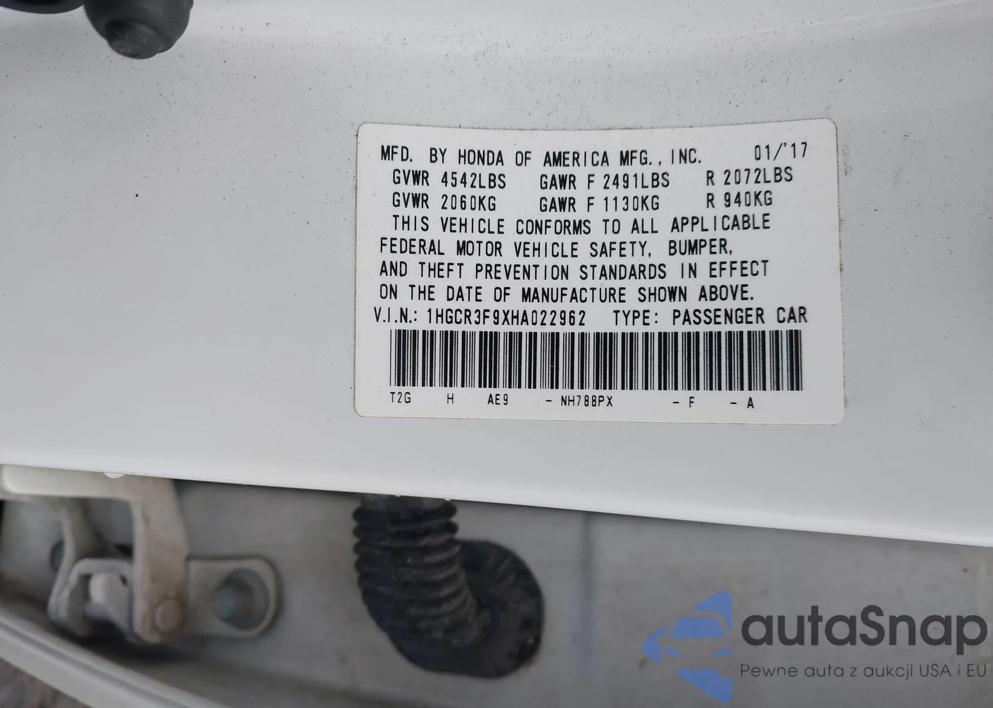 LOT: 43859227 VIN: 1HGCR3F9XHA022962