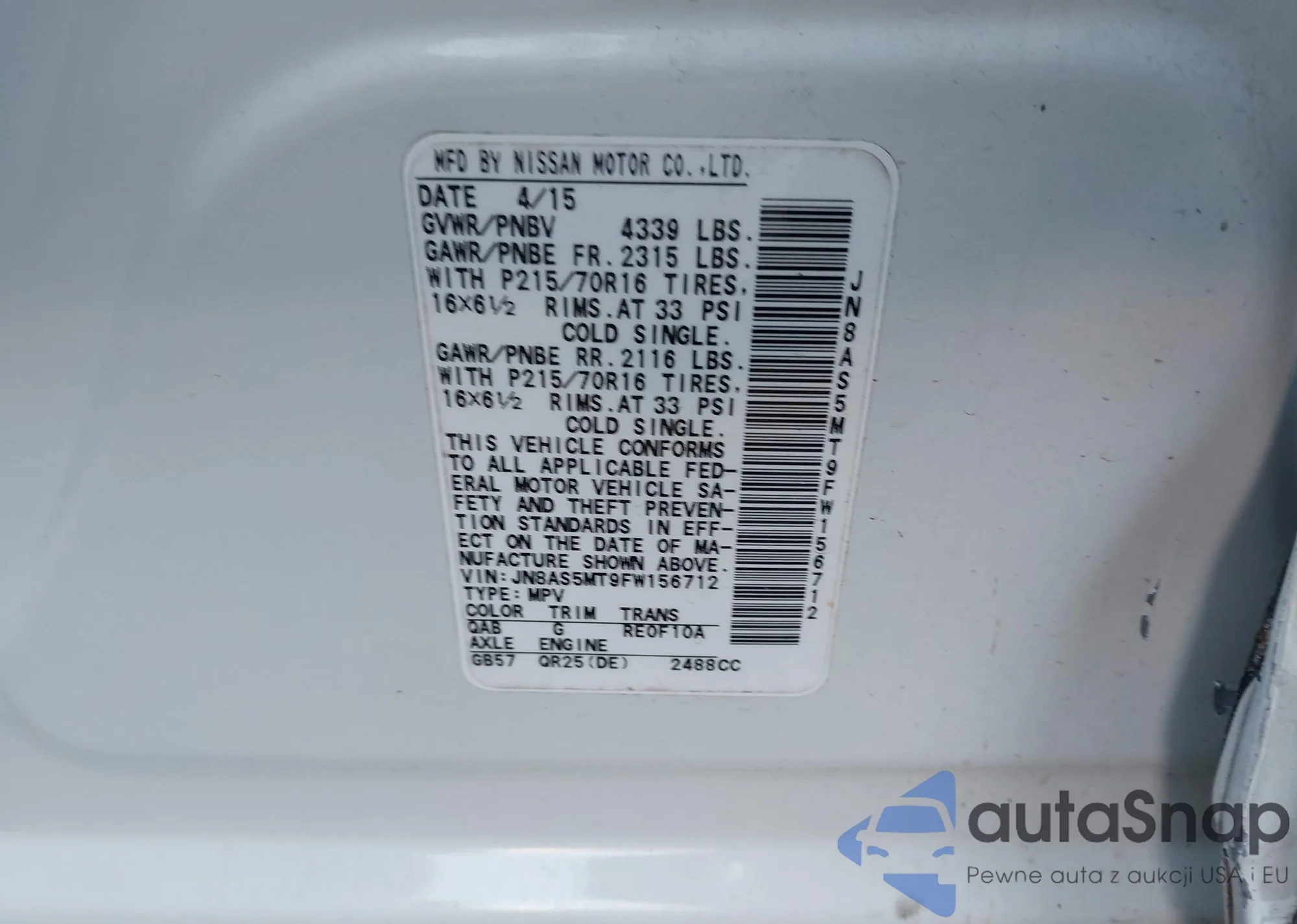 LOT: 43943396 VIN: JN8AS5MT9FW156712