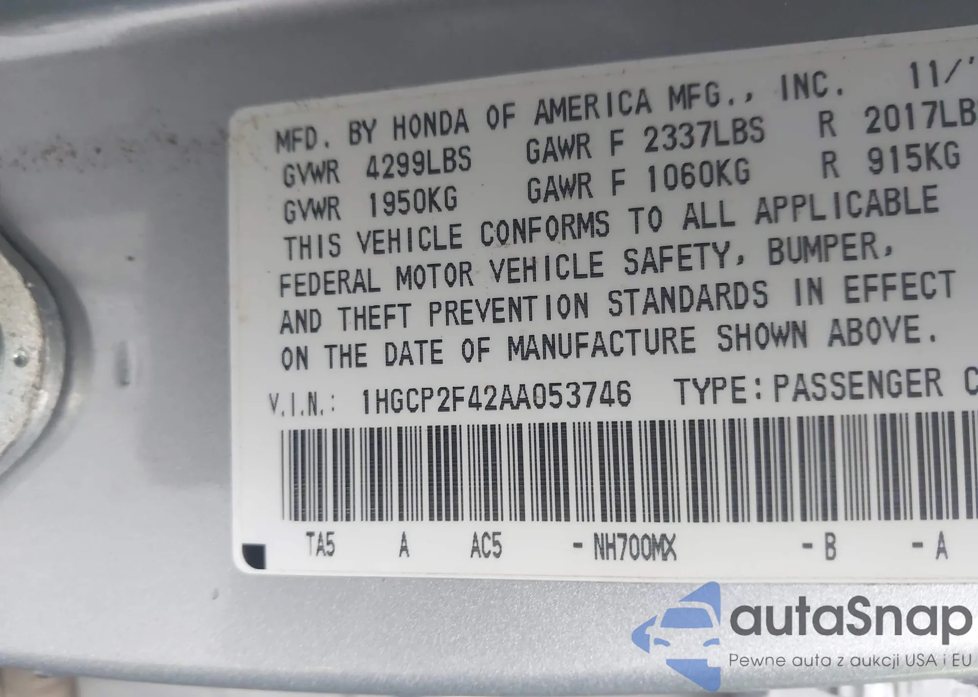 LOT: 44209260 VIN: 1HGCP2F42AA053746